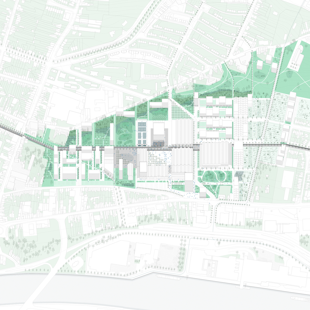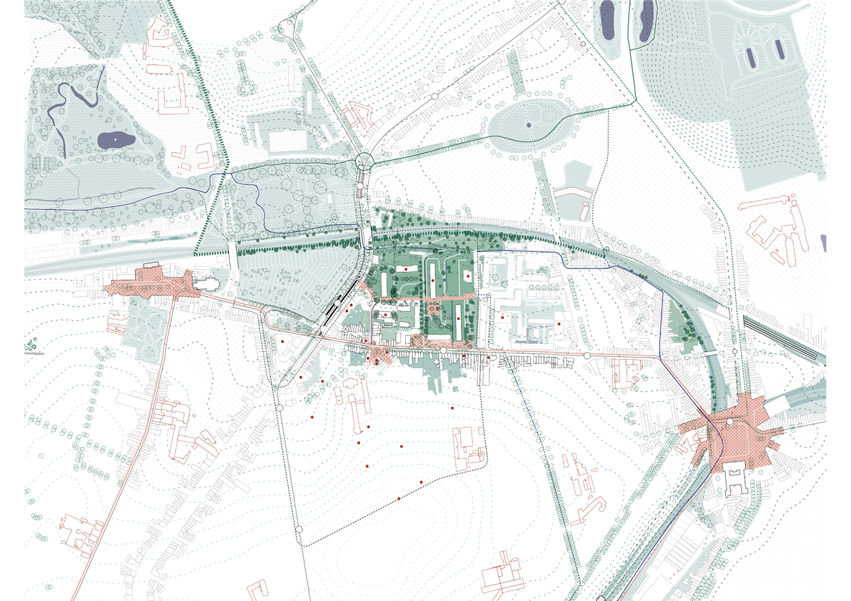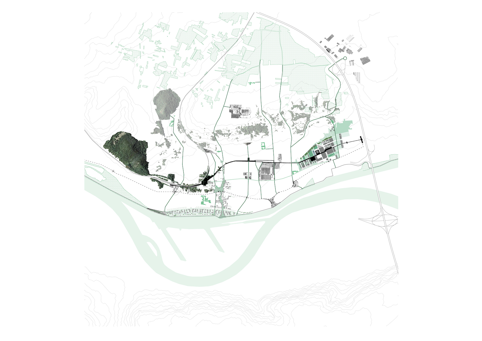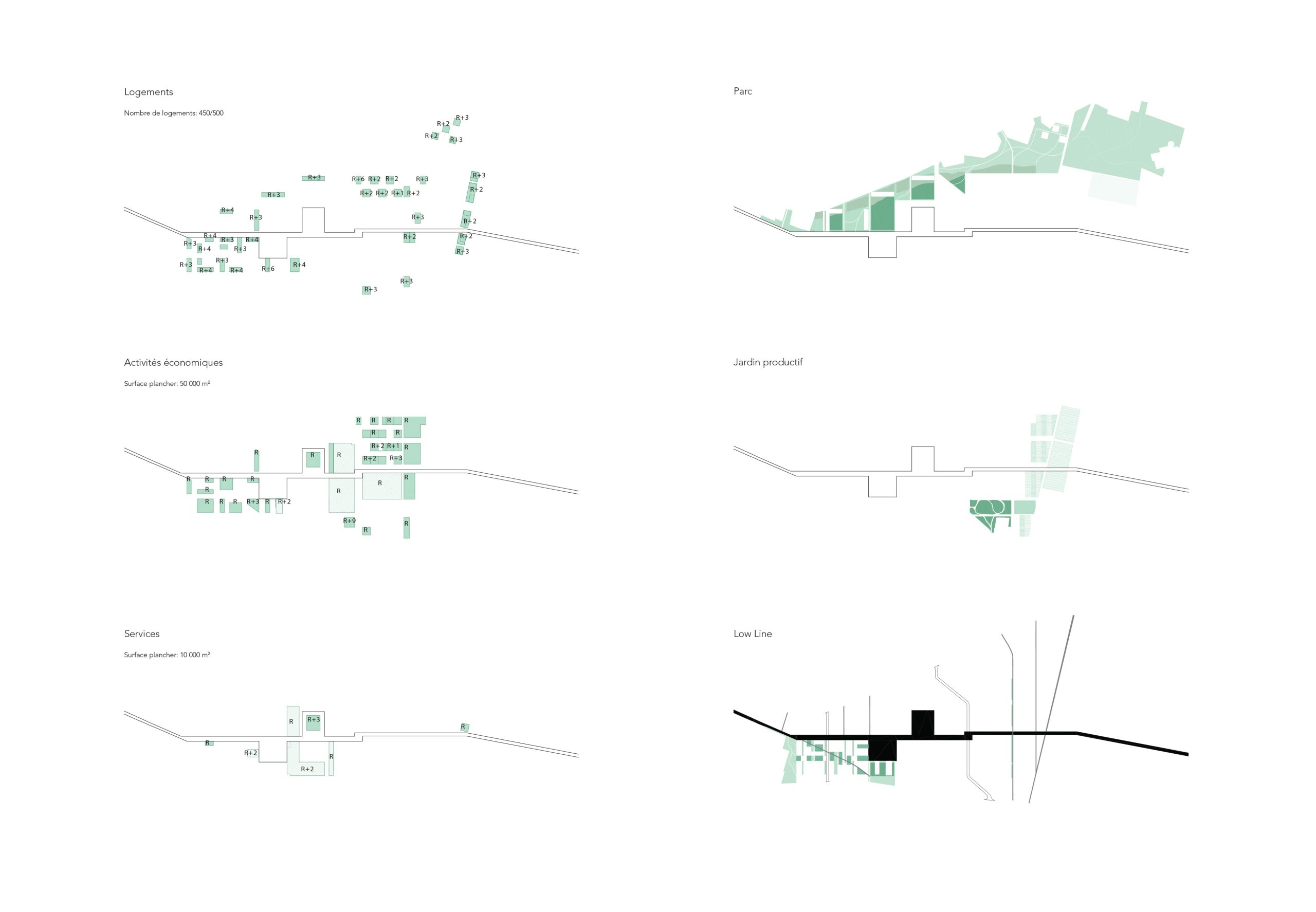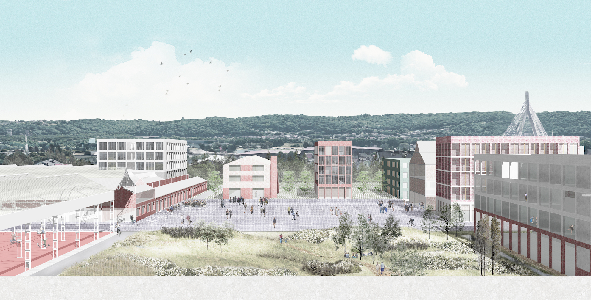 Herstal and the ACEC site are located along the Meuse, in the province of Liège, at the crossroads of the landscapes of the heart of Europe: the Ardennes south, agricultural plains in the north, the landscape of the Meuse and the landscape produced by the European mining belt. These different landscapes can be recognized at the scale of the site: the proximity of productive lands, the presence of the Meuse, the industrial heritage and the remaining trace of an old industrial railway linking the ACEC site to Herstal station, crossing the city. The project is about moving the image from the industrial city to the "green city" by focusing on innovation and inventing a new mix between housing and production. In the north part of the site a new green continuity find place: a “productive garden” is created due to the presence of “Verdir”, a research project developed by the Liege university.
