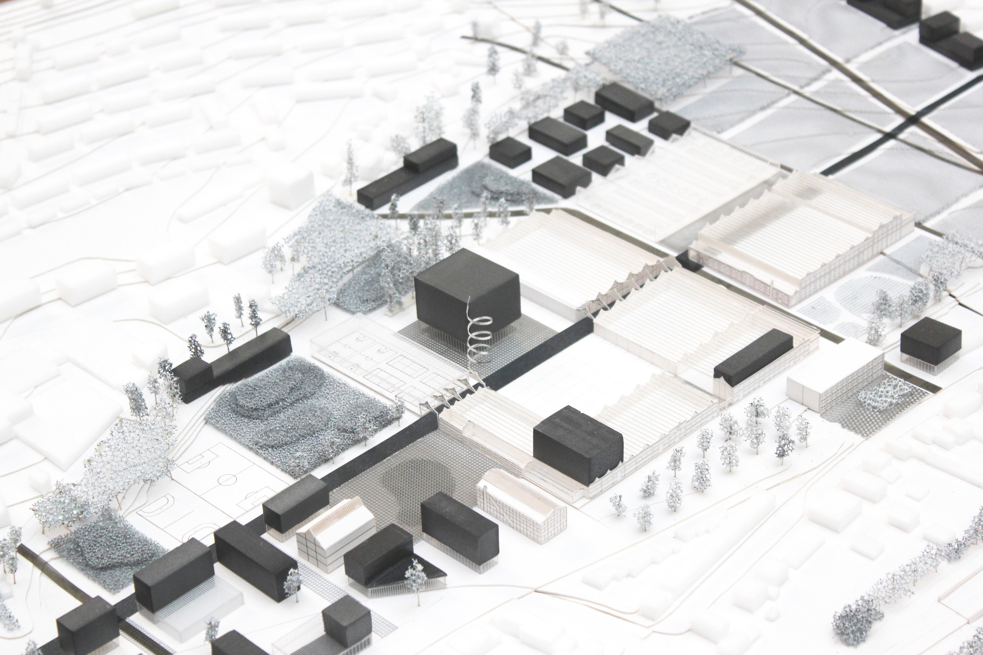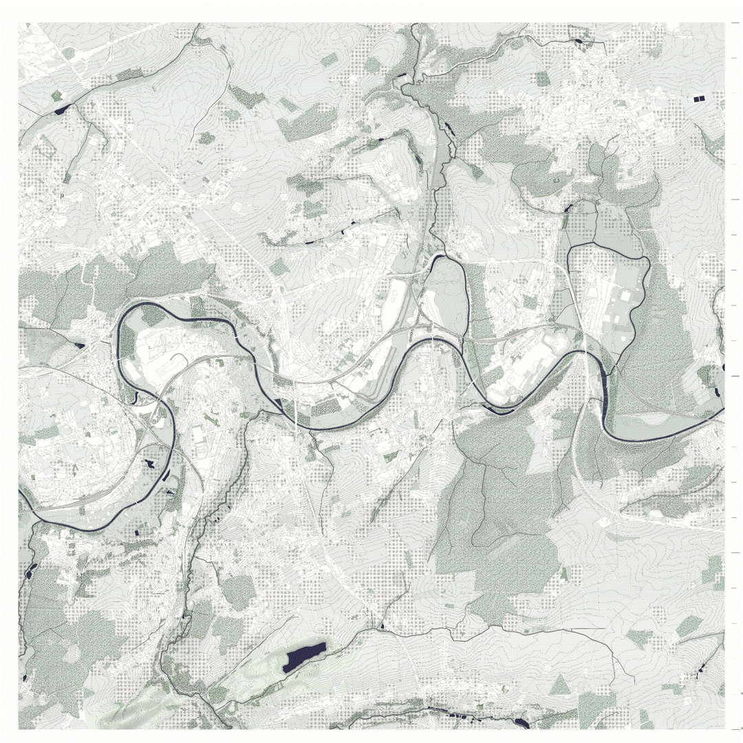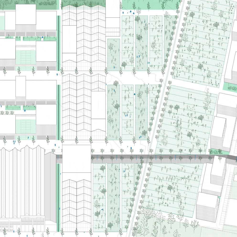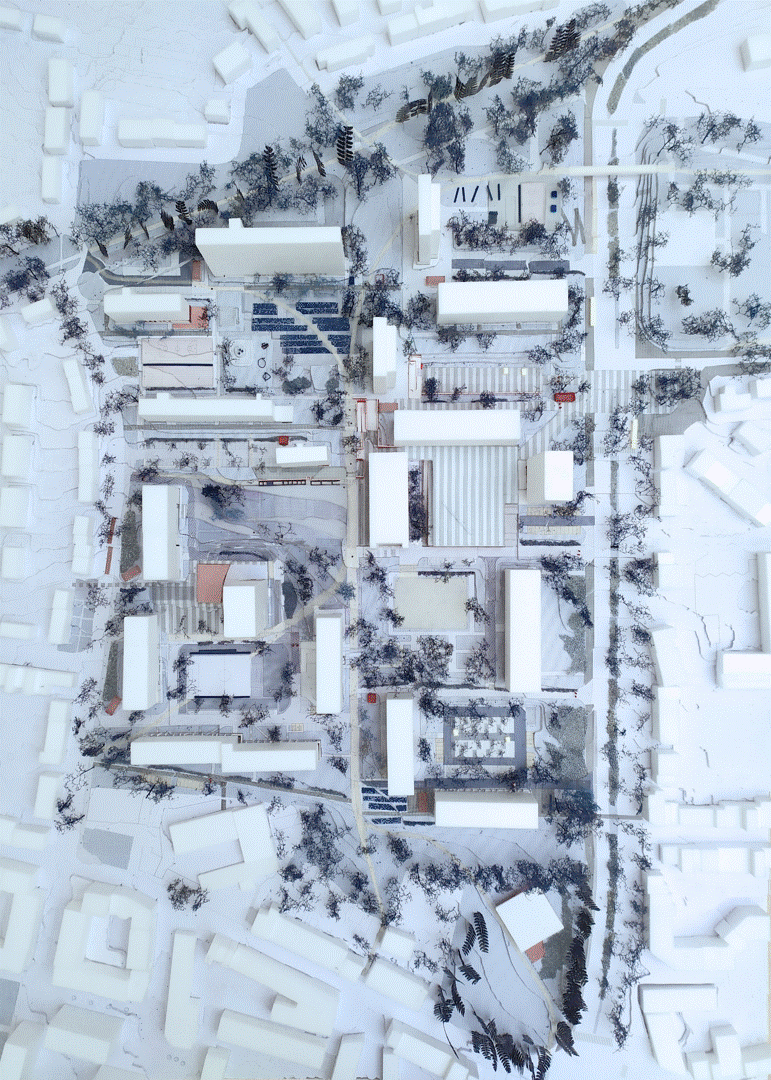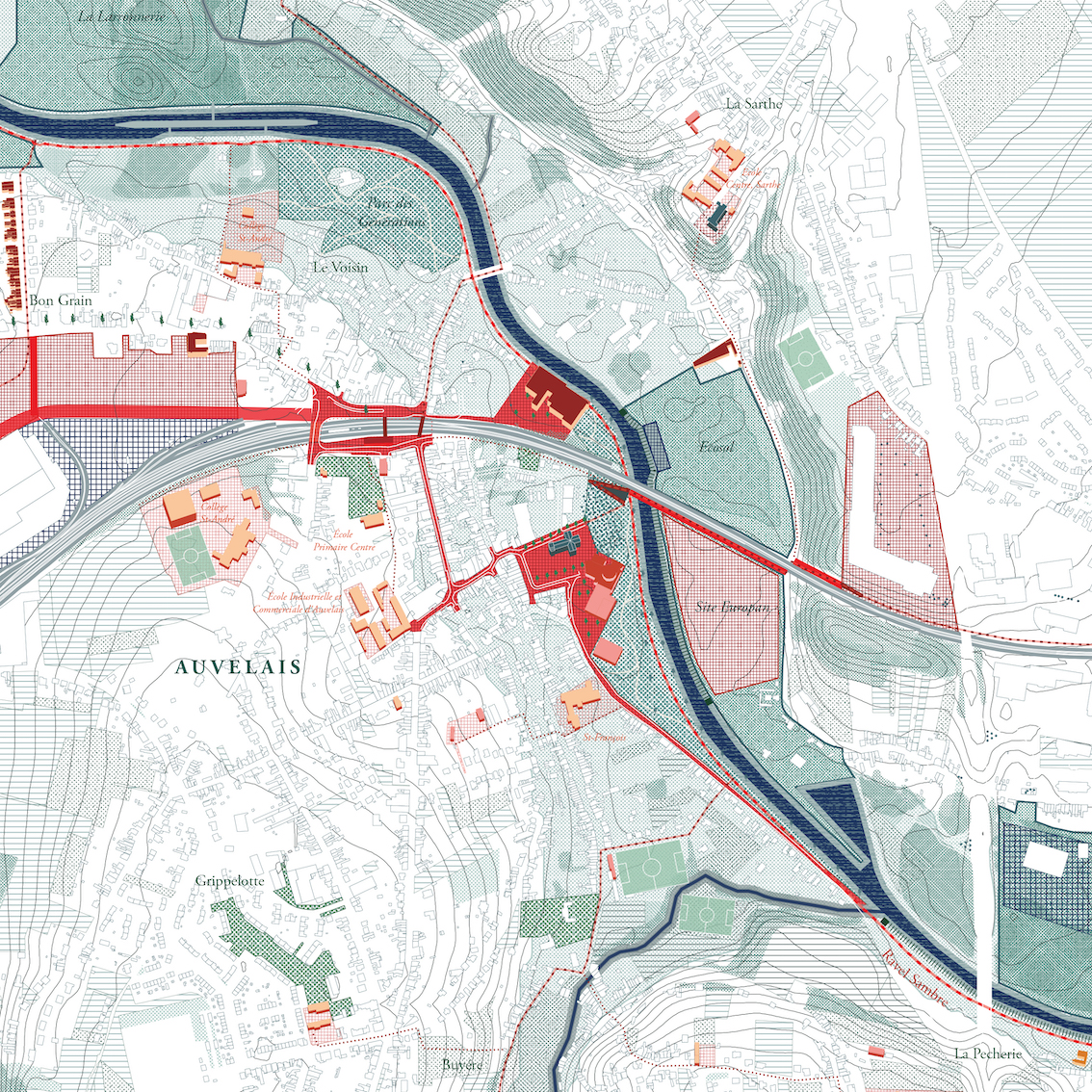 Herstal and the ACEC site are located along the Meuse, in the province of Liège, at the crossroads of the landscapes of the heart of Europe: the Ardennes south, agricultural plains in the north, the landscape of the Meuse and the landscape produced by the European mining belt. These different landscapes can be recognized at the scale of the site: the proximity of productive lands, the presence of the Meuse, the industrial heritage and the remaining trace of an old industrial railway linking the ACEC site to Herstal station, crossing the city. The project is about moving the image from the industrial city to the "green city" by focusing on innovation and inventing a new mix between housing and production. In the north part of the site a new green continuity find place: a “productive garden” is created due to the presence of “Verdir”, a research project developed by the Liege university.