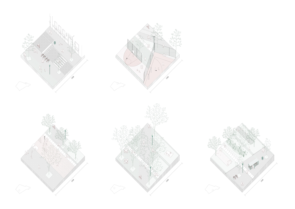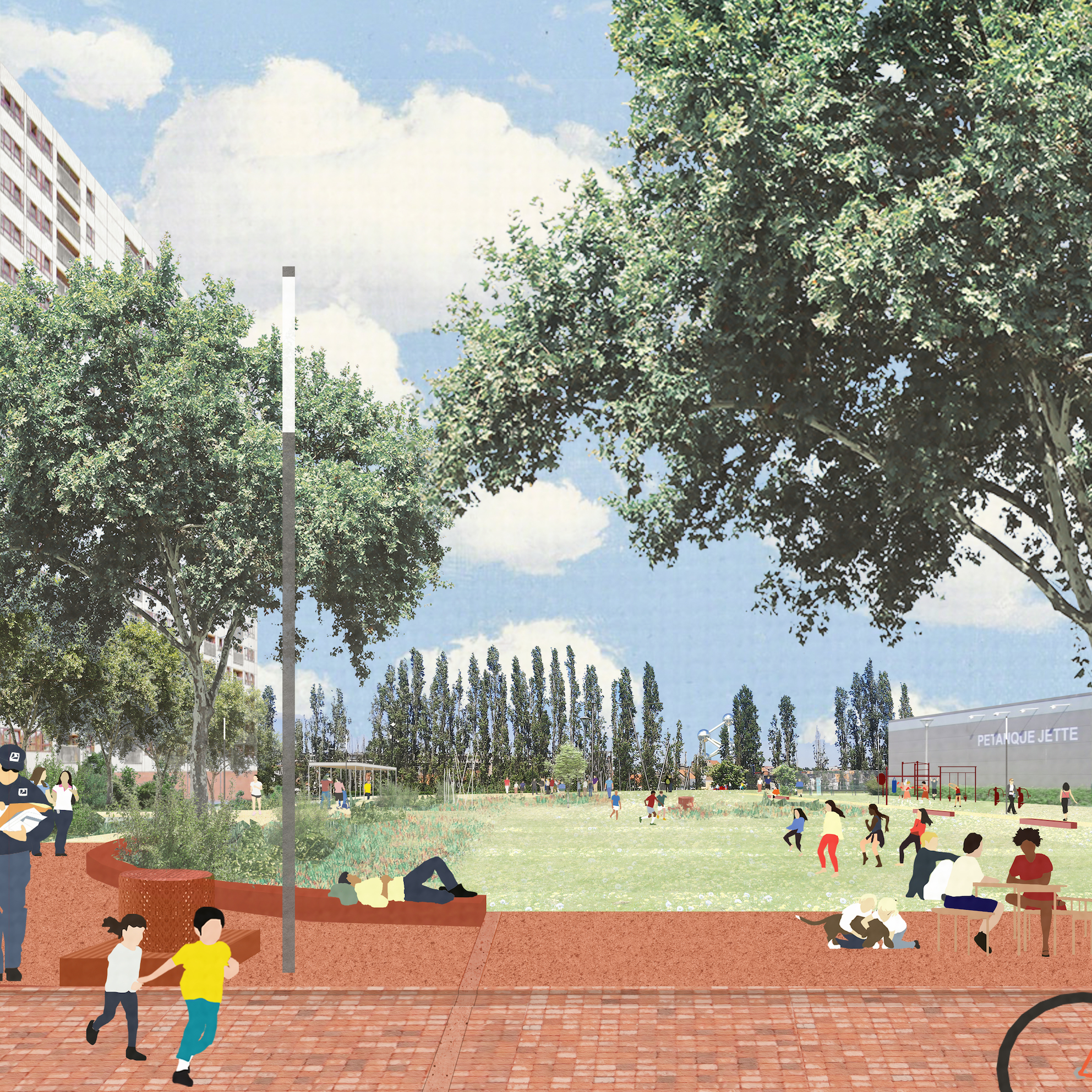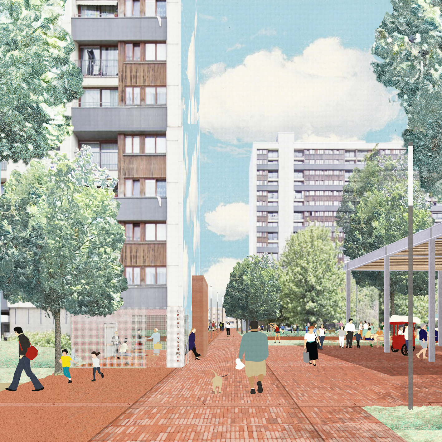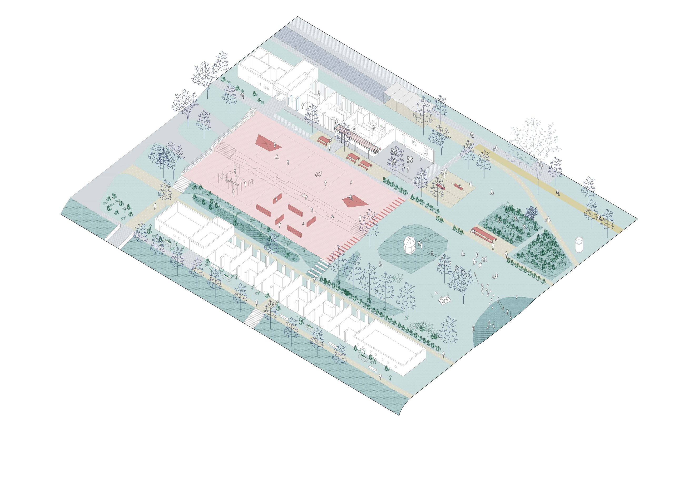 In the 1960’ and 1970’, modern architects constructed a neighbourhood of 600 dwellings in 4 ‘bars’ in the valley slopes of an old industrial site. The project arose with the generous ambition to become an inhabited park. Nevertheless, it remained a promise, the reality is an enclaved neighbourhood, constricted in its borders, inhabited by cars. Through the gaze of Magritte, after whom the Sustainable neighbourhood contract was named, we intend to surpass this reality, in which reality becomes object of imagination and imagination can soften the harshness of the condition. The project develops along two gestures. The first is an East-West gesture, a red carpet enrols through the site as a promenade linking the neighbourhood to its urban environment. This red axis grafts the site to important infrastructures and forms the structuring element for activity, enlarging into squares at the hearth of the neighbourhood. The second gesture connects the landscape. A North-South path follows the natural slope of the valley bringing human and non-human through the site along it’s prairies towards the future ‘green network park’ along the railway.