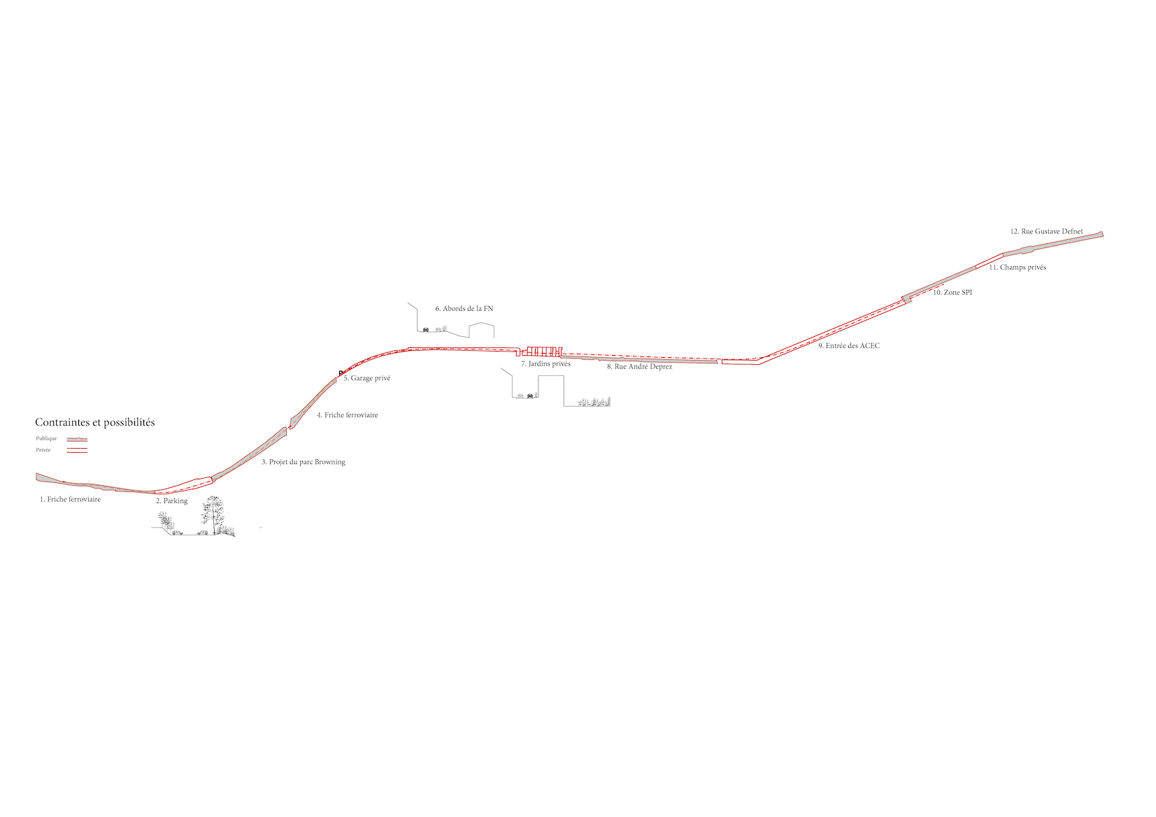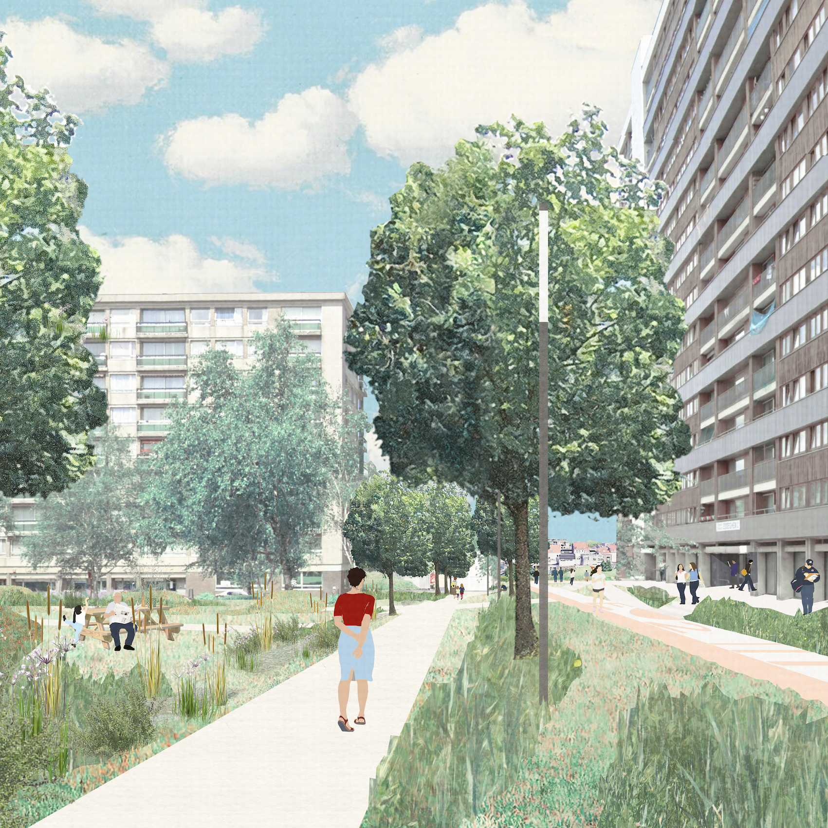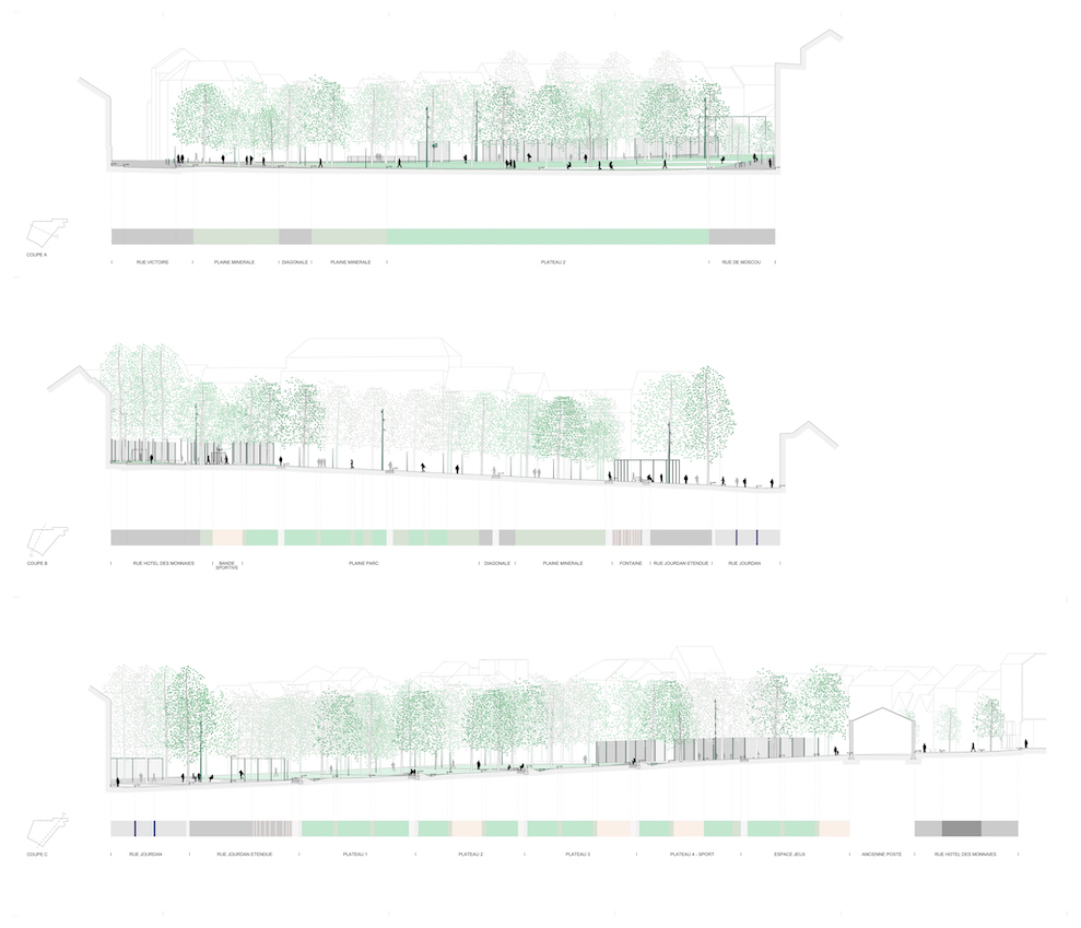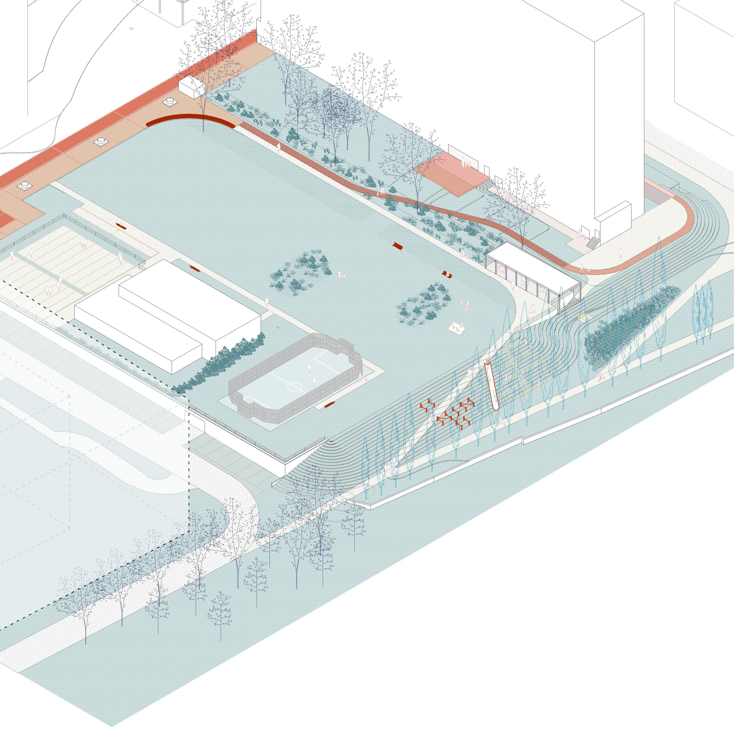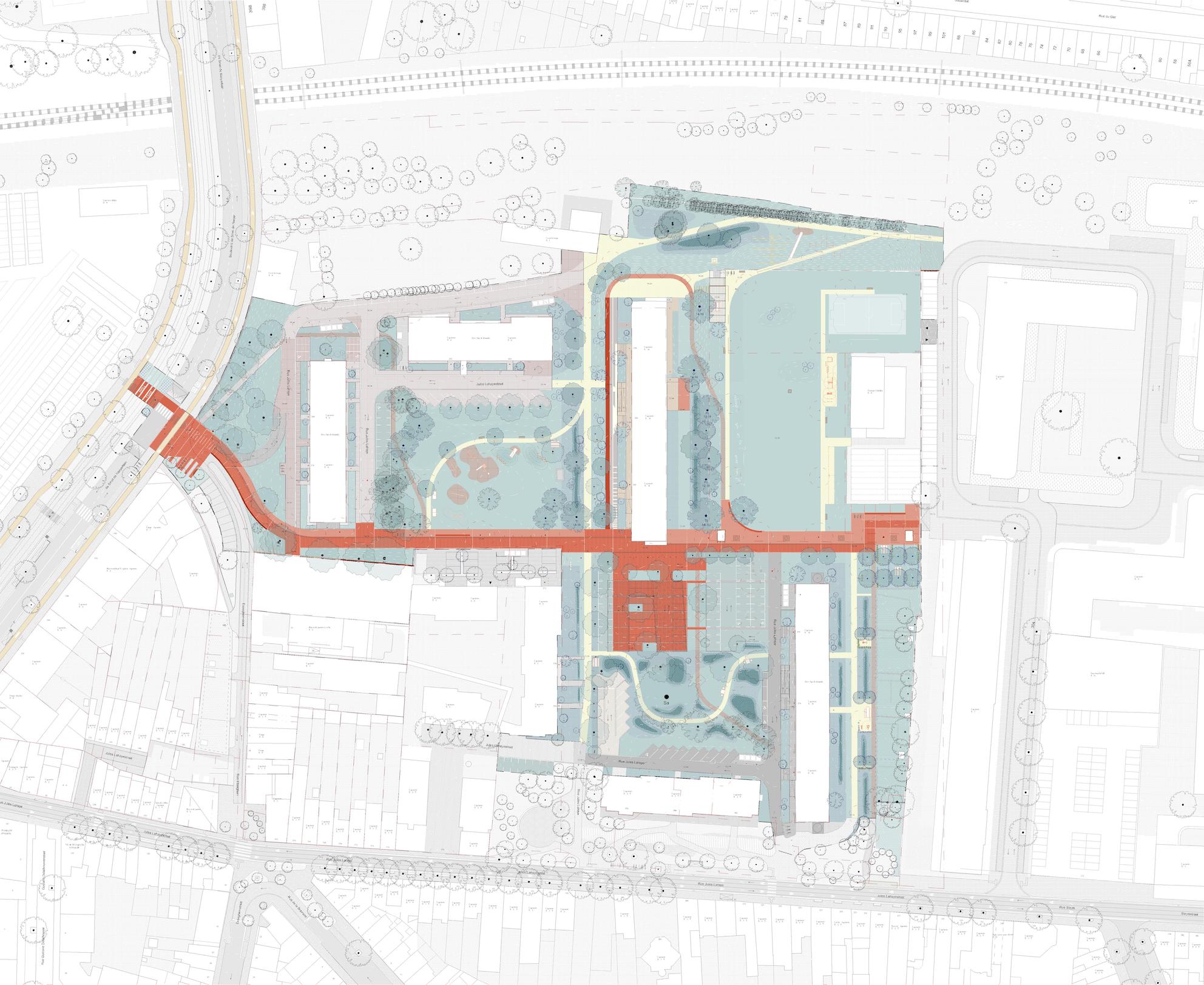 In the 1960’ and 1970’, modern architects constructed a neighbourhood of 600 dwellings in 4 ‘bars’ in the valley slopes of an old industrial site. The project arose with the generous ambition to become an inhabited park. Nevertheless, it remained a promise, the reality is an enclaved neighbourhood, constricted in its borders, inhabited by cars. Through the gaze of Magritte, after whom the Sustainable neighbourhood contract was named, we intend to surpass this reality, in which reality becomes object of imagination and imagination can soften the harshness of the condition. The project develops along two gestures. The first is an East-West gesture, a red carpet enrols through the site as a promenade linking the neighbourhood to its urban environment. This red axis grafts the site to important infrastructures and forms the structuring element for activity, enlarging into squares at the hearth of the neighbourhood. The second gesture connects the landscape. A North-South path follows the natural slope of the valley bringing human and non-human through the site along it’s prairies towards the future ‘green network park’ along the railway.
