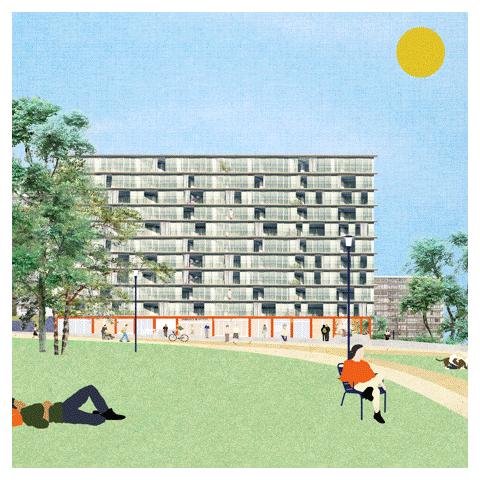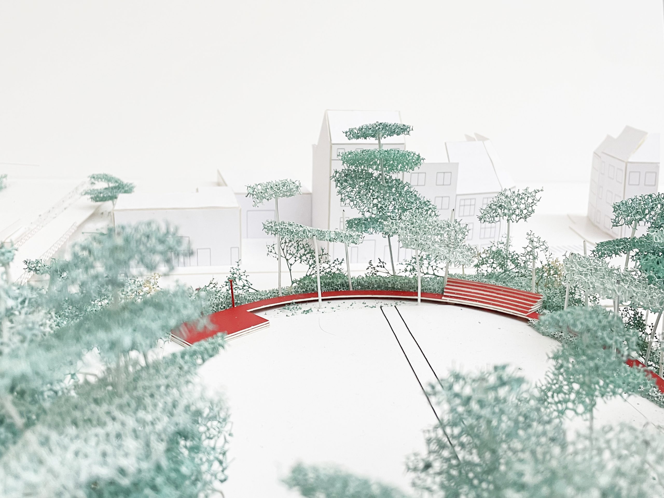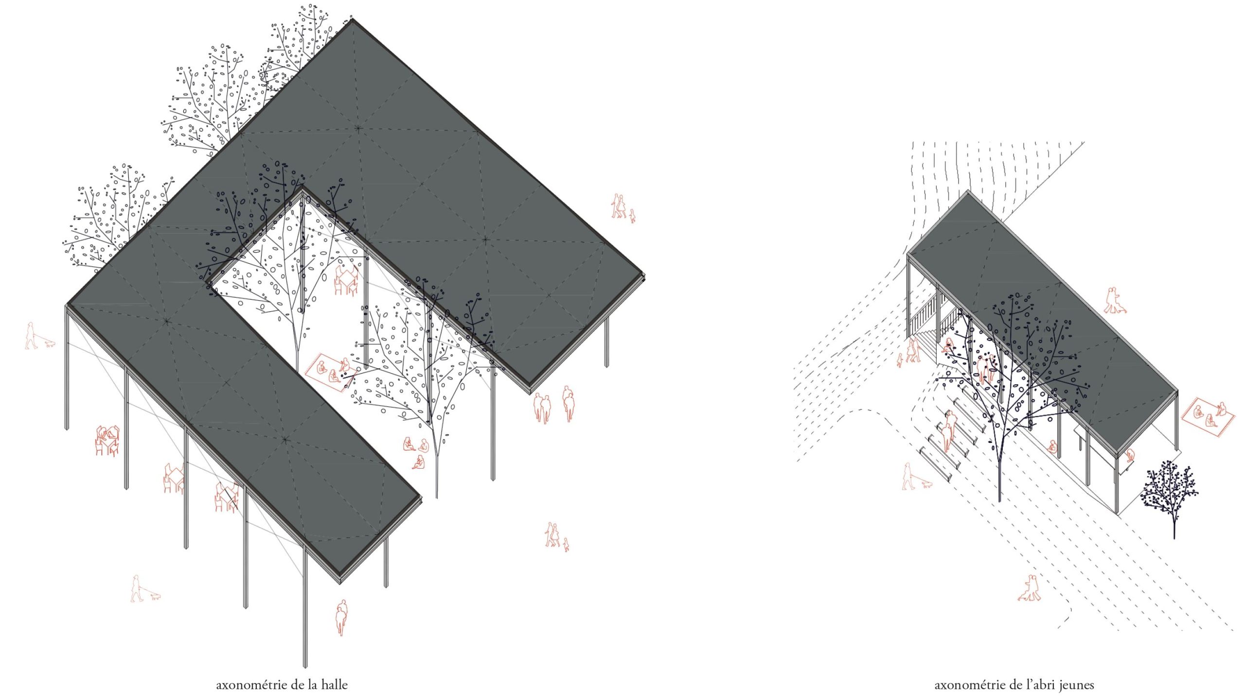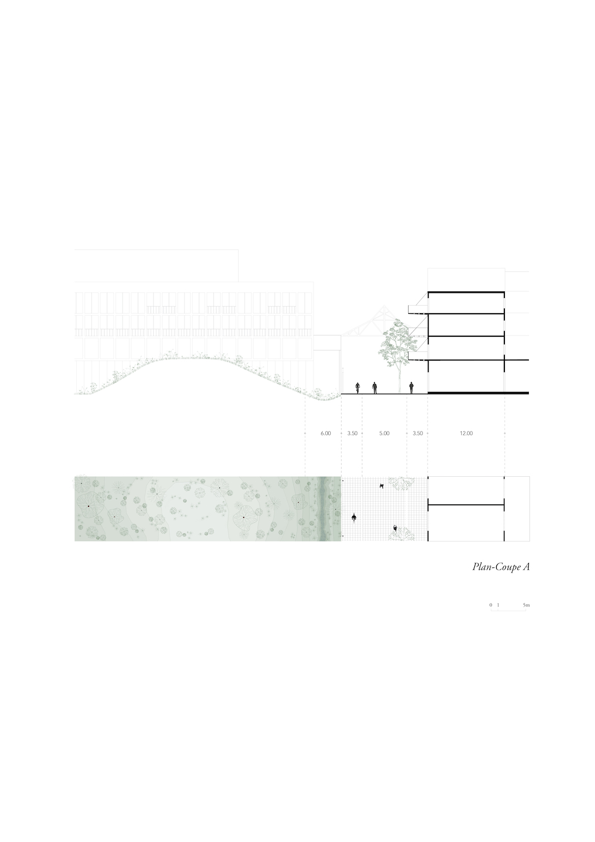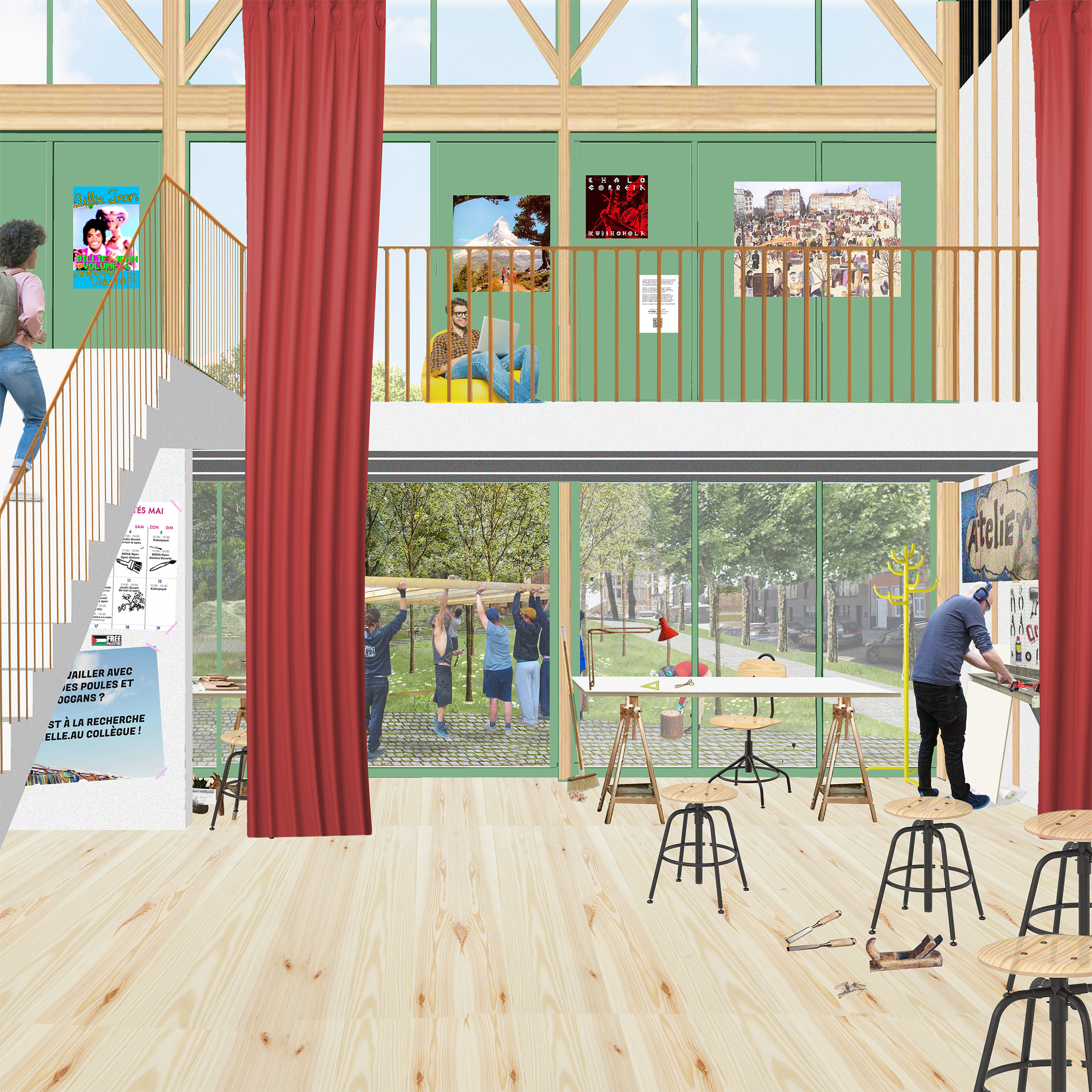 In the 1960’ and 1970’, modern architects constructed a neighbourhood of 600 dwellings in 4 ‘bars’ in the valley slopes of an old industrial site. The project arose with the generous ambition to become an inhabited park. Nevertheless, it remained a promise, the reality is an enclaved neighbourhood, constricted in its borders, inhabited by cars. Through the gaze of Magritte, after whom the Sustainable neighbourhood contract was named, we intend to surpass this reality, in which reality becomes object of imagination and imagination can soften the harshness of the condition. The project develops along two gestures. The first is an East-West gesture, a red carpet enrols through the site as a promenade linking the neighbourhood to its urban environment. This red axis grafts the site to important infrastructures and forms the structuring element for activity, enlarging into squares at the hearth of the neighbourhood. The second gesture connects the landscape. A North-South path follows the natural slope of the valley bringing human and non-human through the site along it’s prairies towards the future ‘green network park’ along the railway.
