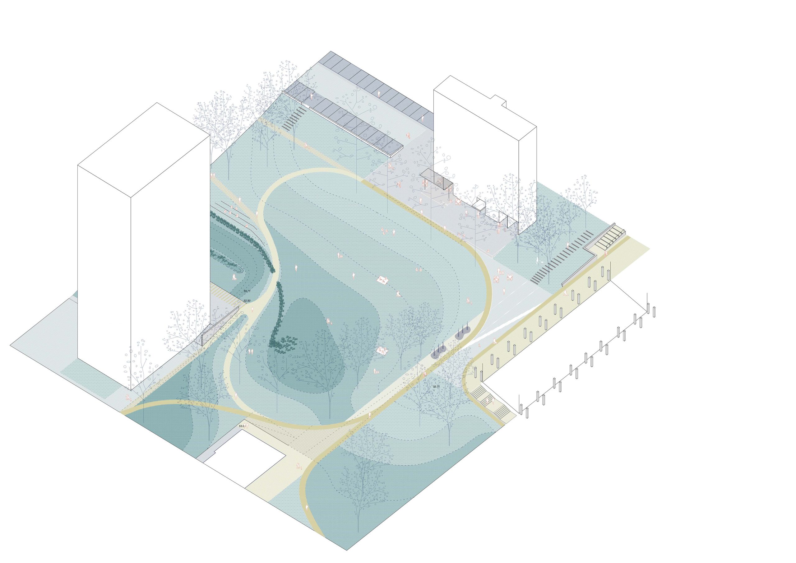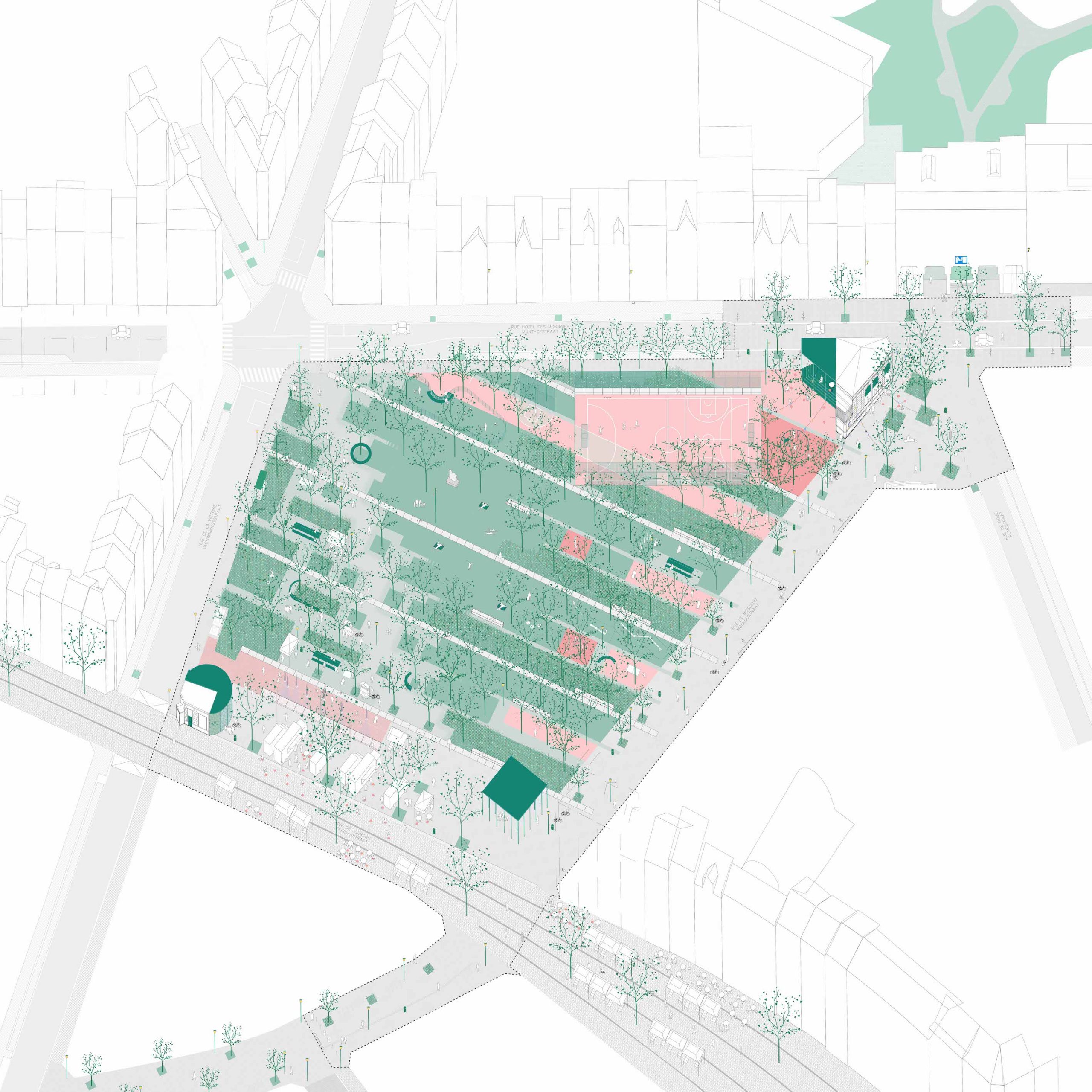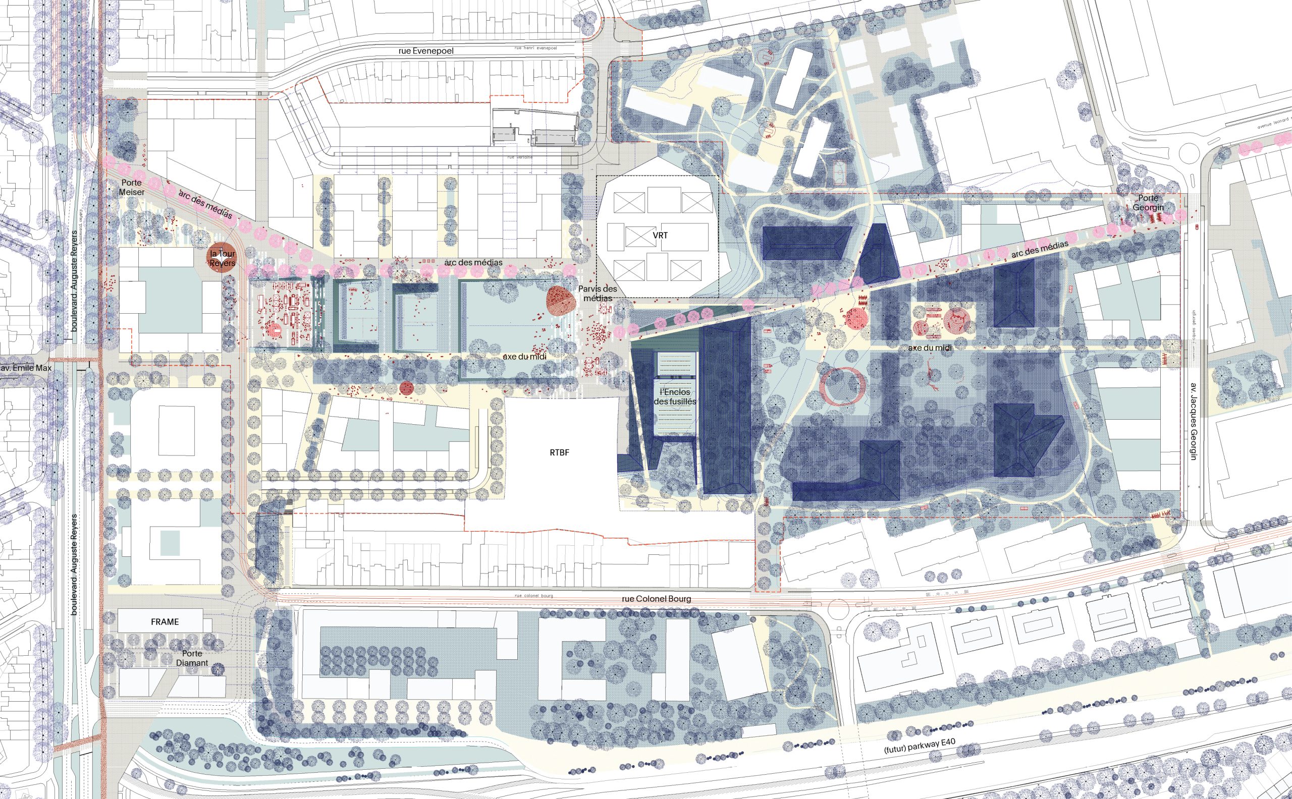 Lying between Chaussée de Louvain, Boulevard Reyers and the Liège motorway (E40) and connected by the public transport hub of Meiser and Diamant, Mediapark is one of the major strategic development of the capital region, where a cluster of some 382,000 m² new program, including 1,600 homes and related services and facilities (shops, schools, nurseries, etc.) and the development of a 30,000 m² site to accommodate 5000 workers from new businesses in the media sector and other measures. After the masterplan (2018), the design team won the design of the public space through a 2-stage international competition in 2022.