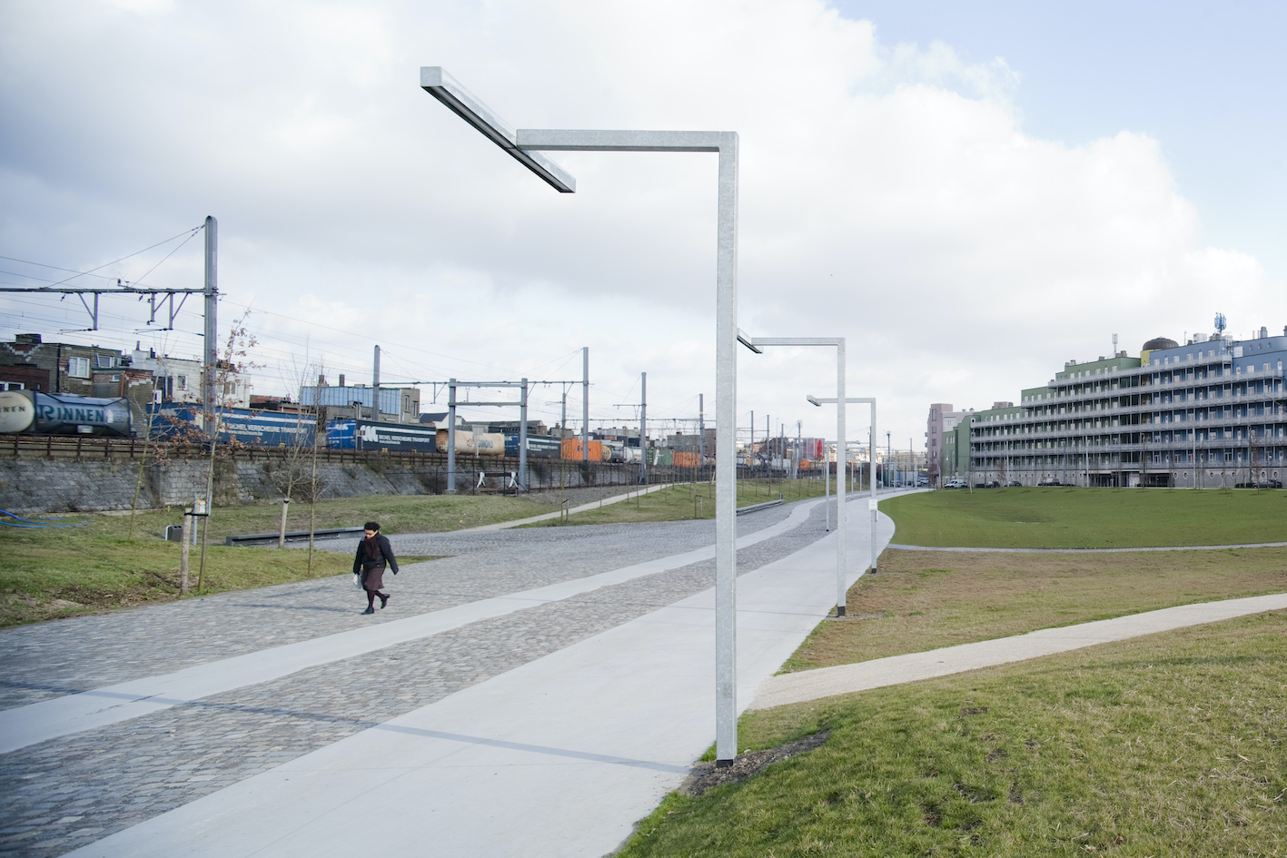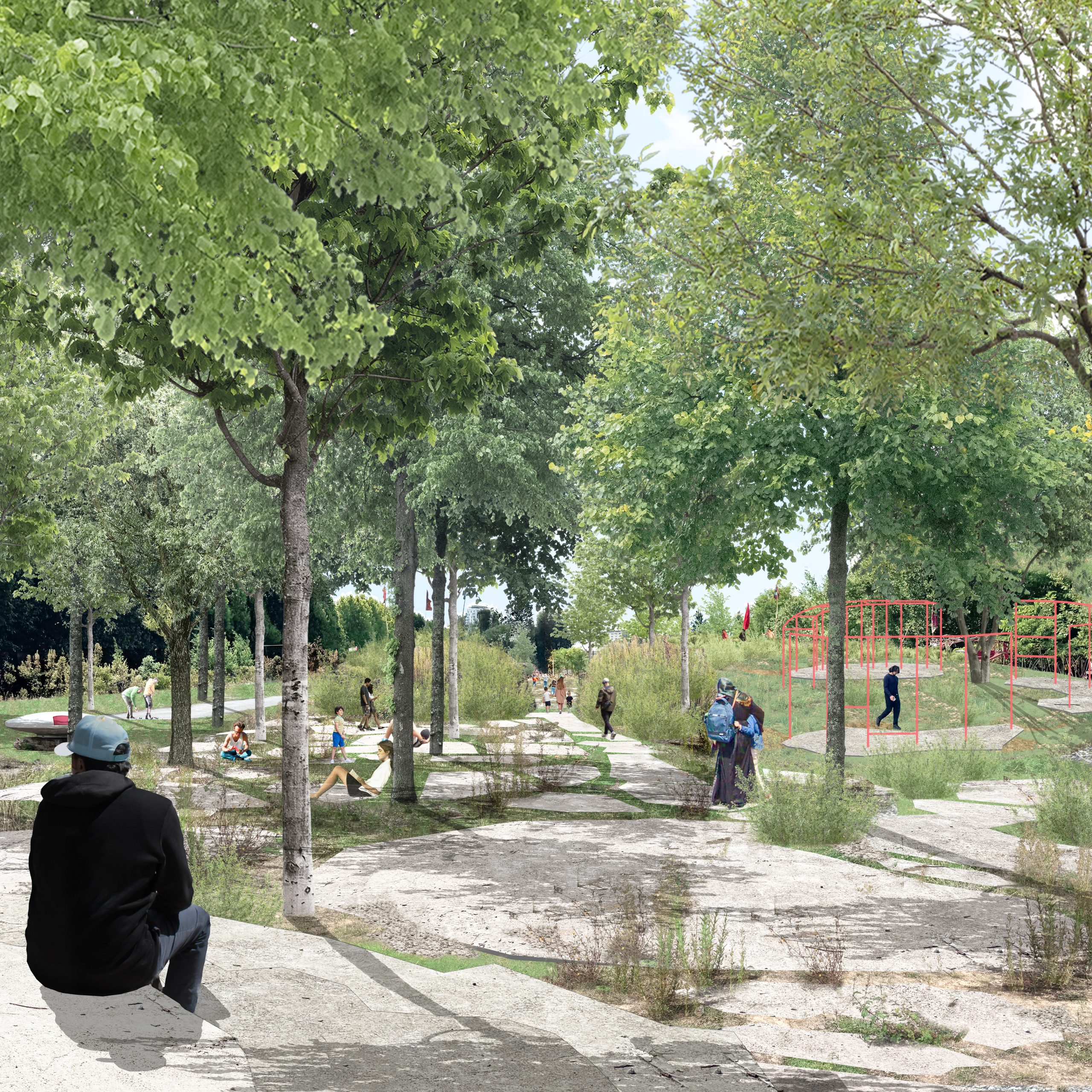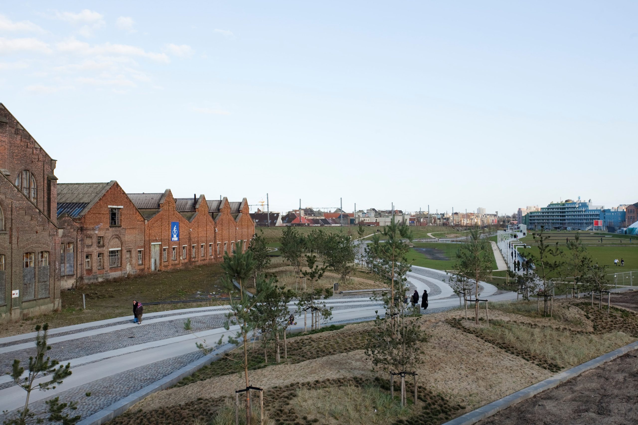 Parc Ouest, located on the former railway barrier that separated upper and lower Molenbeek, forms a long plateau connecting the two banks of the Maelbeek valley, which once ran from Scheutbos to the centre of Brussels. In a context marked by significant socio-economic inequalities and the need to adapt the city to the challenges of transition, the park is becoming a space for emancipation, where people can create, meet and relearn how to live together. The project is part of a system of interconnected parks, in which West Park plays a structuring role: a vast green, productive and cultural space that extends the landscapes of the Pajottenland and its biodiversity and connects the different neighbourhoods. It is designed to support evolving features, covered by a large, continuous, light canopy composed of a mosaic of landscapes: the promenade, the woods, the large meadow, the hills and the equipped slab. The creation of these atmospheres is based on a careful reading of what the site already offers: the landscape of the brownfield, its soil, its topography, its materials and the uses initiated by the Toestand association with the inhabitants. The project aims to co-construct, a park that is exemplary in its resource management: reuse of existing materials, gradual improvement of soils with a minimum of excavation and backfilling, sustainable water management and landscape evolution through a design by maintenance.