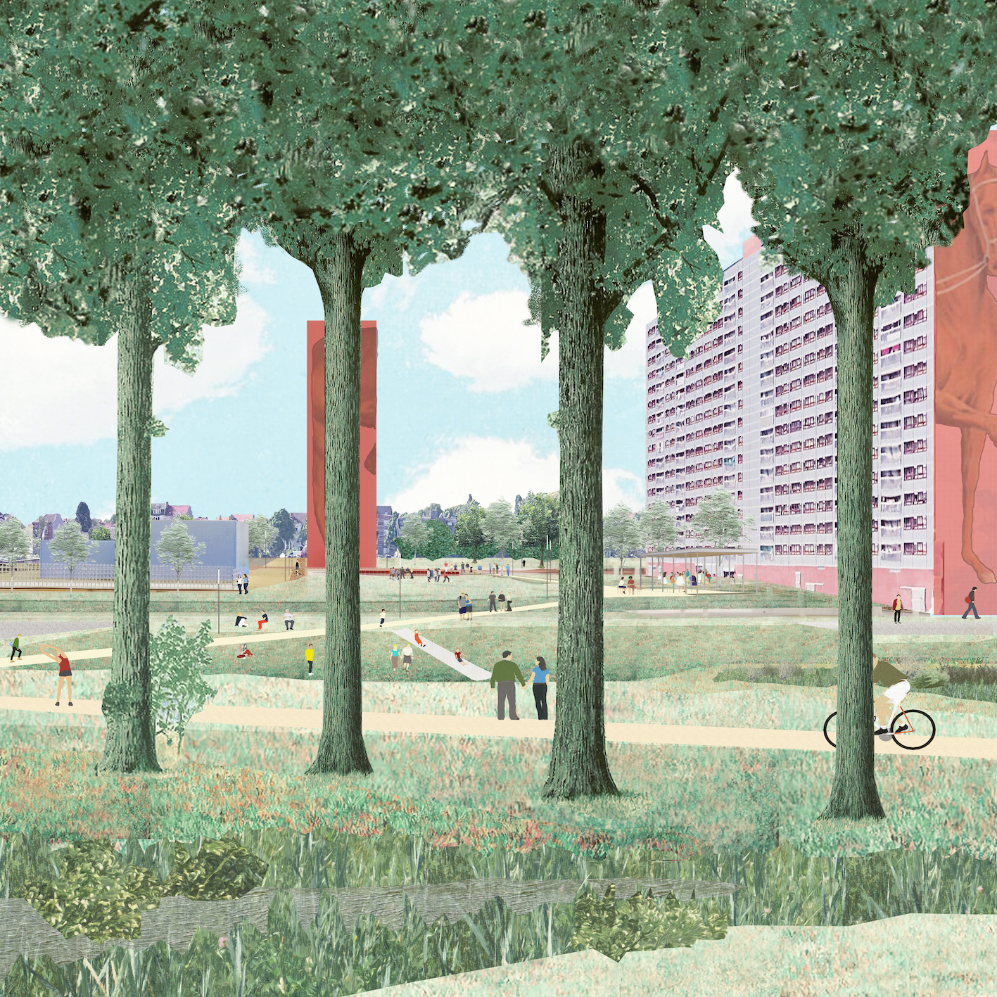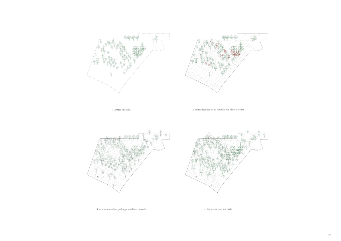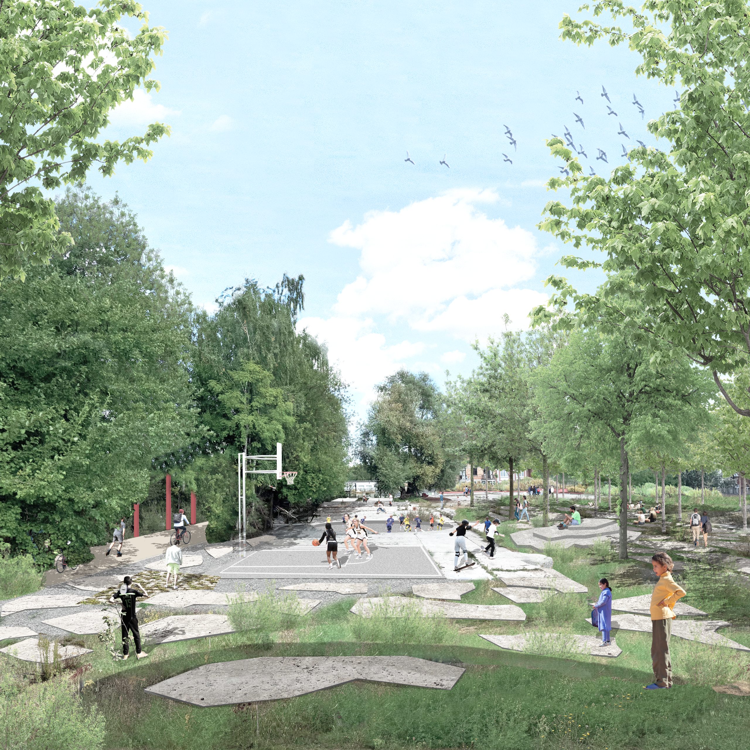 Parc Ouest, located on the former railway barrier that separated upper and lower Molenbeek, forms a long plateau connecting the two banks of the Maelbeek valley, which once ran from Scheutbos to the centre of Brussels. In a context marked by significant socio-economic inequalities and the need to adapt the city to the challenges of transition, the park is becoming a space for emancipation, where people can create, meet and relearn how to live together. The project is part of a system of interconnected parks, in which West Park plays a structuring role: a vast green, productive and cultural space that extends the landscapes of the Pajottenland and its biodiversity and connects the different neighbourhoods. It is designed to support evolving features, covered by a large, continuous, light canopy composed of a mosaic of landscapes: the promenade, the woods, the large meadow, the hills and the equipped slab. The creation of these atmospheres is based on a careful reading of what the site already offers: the landscape of the brownfield, its soil, its topography, its materials and the uses initiated by the Toestand association with the inhabitants. The project aims to co-construct, a park that is exemplary in its resource management: reuse of existing materials, gradual improvement of soils with a minimum of excavation and backfilling, sustainable water management and landscape evolution through a design by maintenance.