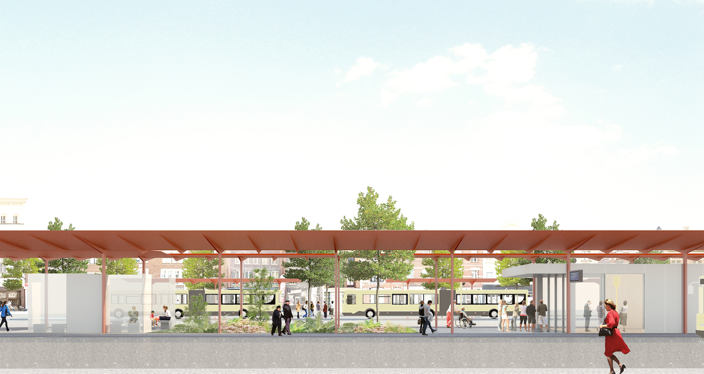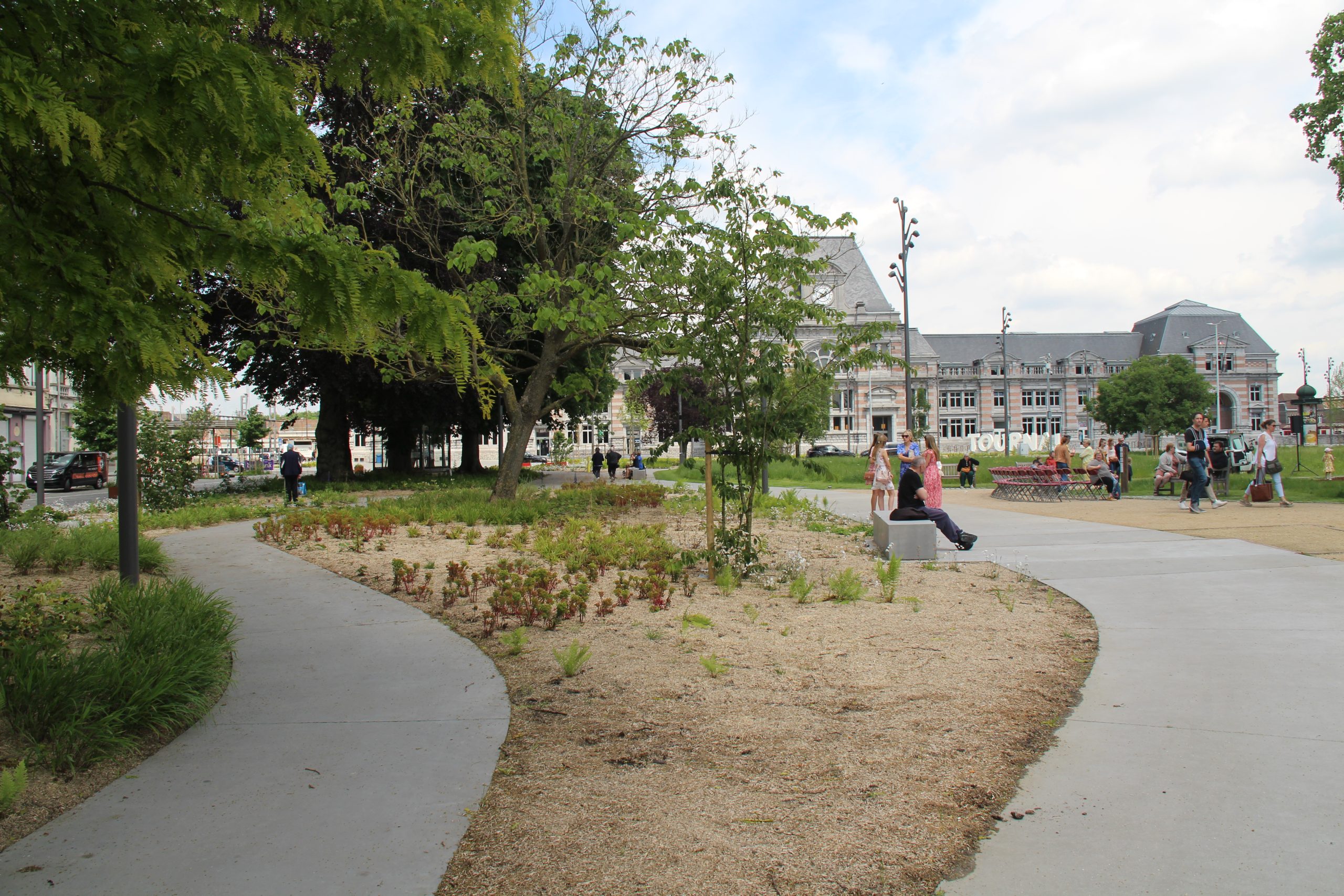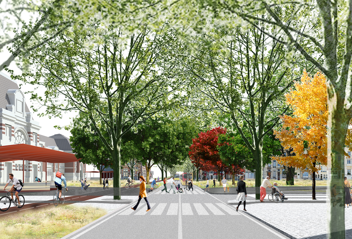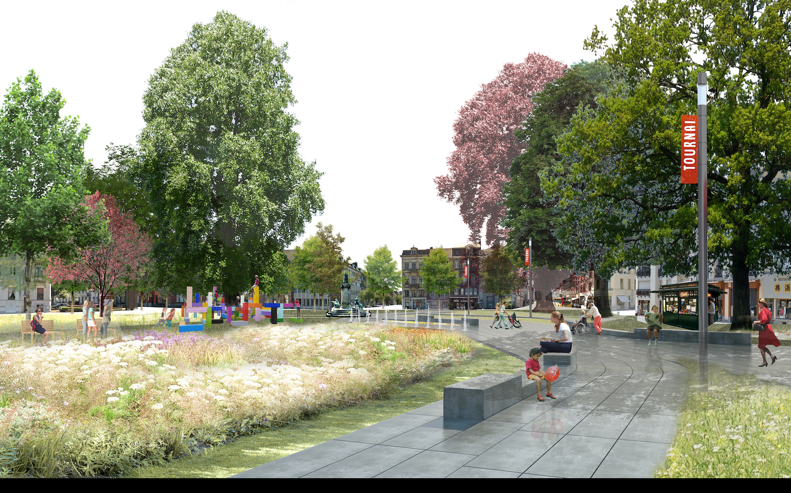 The Tournai station platform is located on the ring of boulevards in the northern part of Tournai. This intermodal project and public space redevelopment project on the station plateau gives public transport and soft mobility a central role. The urban and landscape quality of the extension of the Crombez Park from façade to façade and the redevelopment of the Rue Royale, which offers a long view of Tournai Cathedral, are also considered.