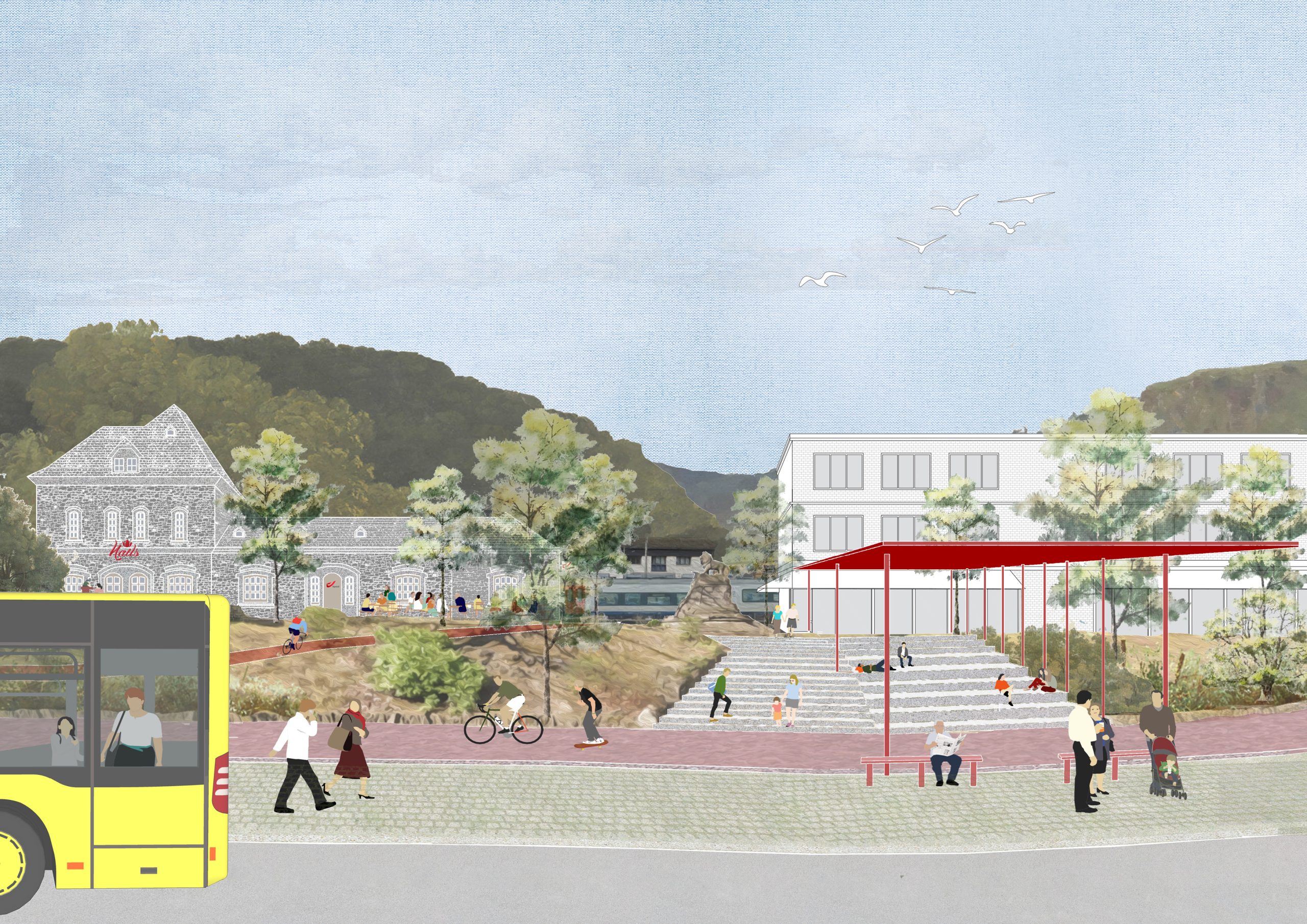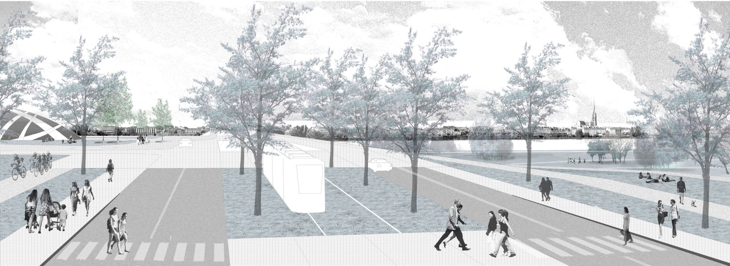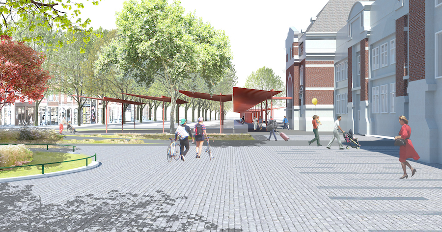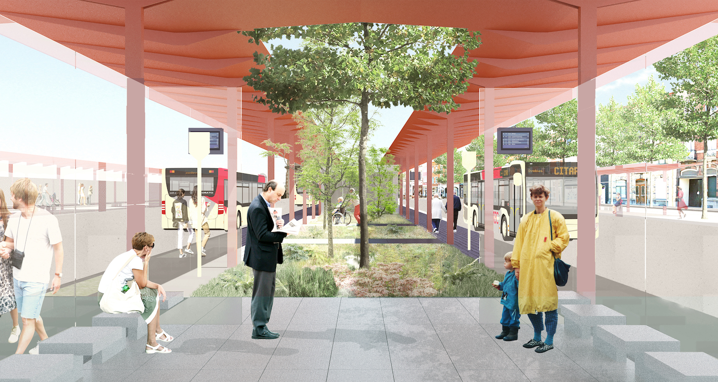 The Tournai station platform is located on the ring of boulevards in the northern part of Tournai. This intermodal project and public space redevelopment project on the station plateau gives public transport and soft mobility a central role. The urban and landscape quality of the extension of the Crombez Park from façade to façade and the redevelopment of the Rue Royale, which offers a long view of Tournai Cathedral, are also considered.