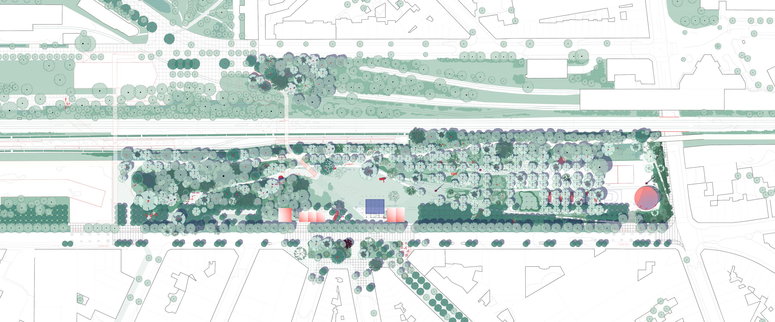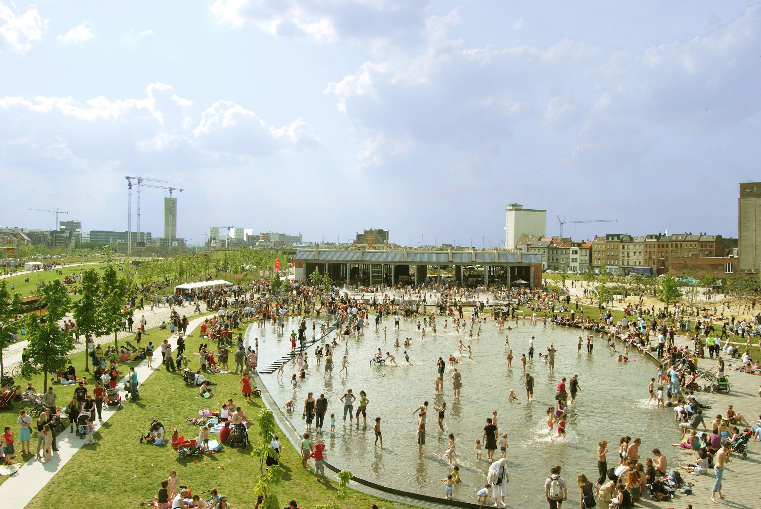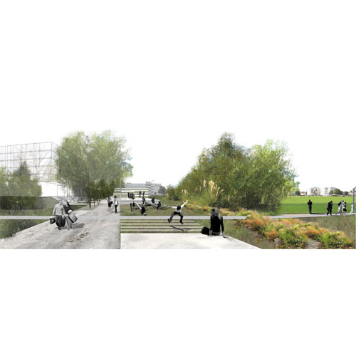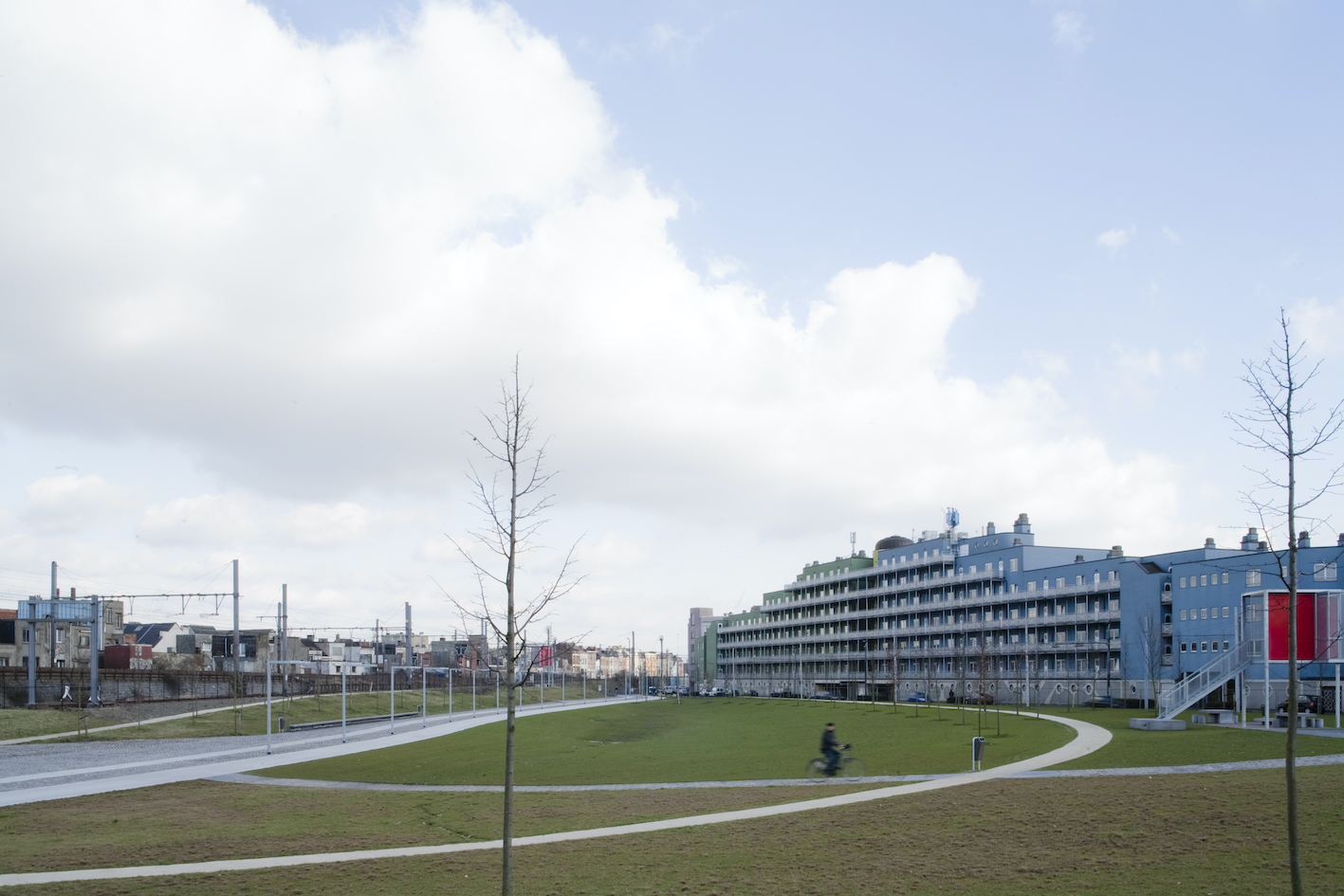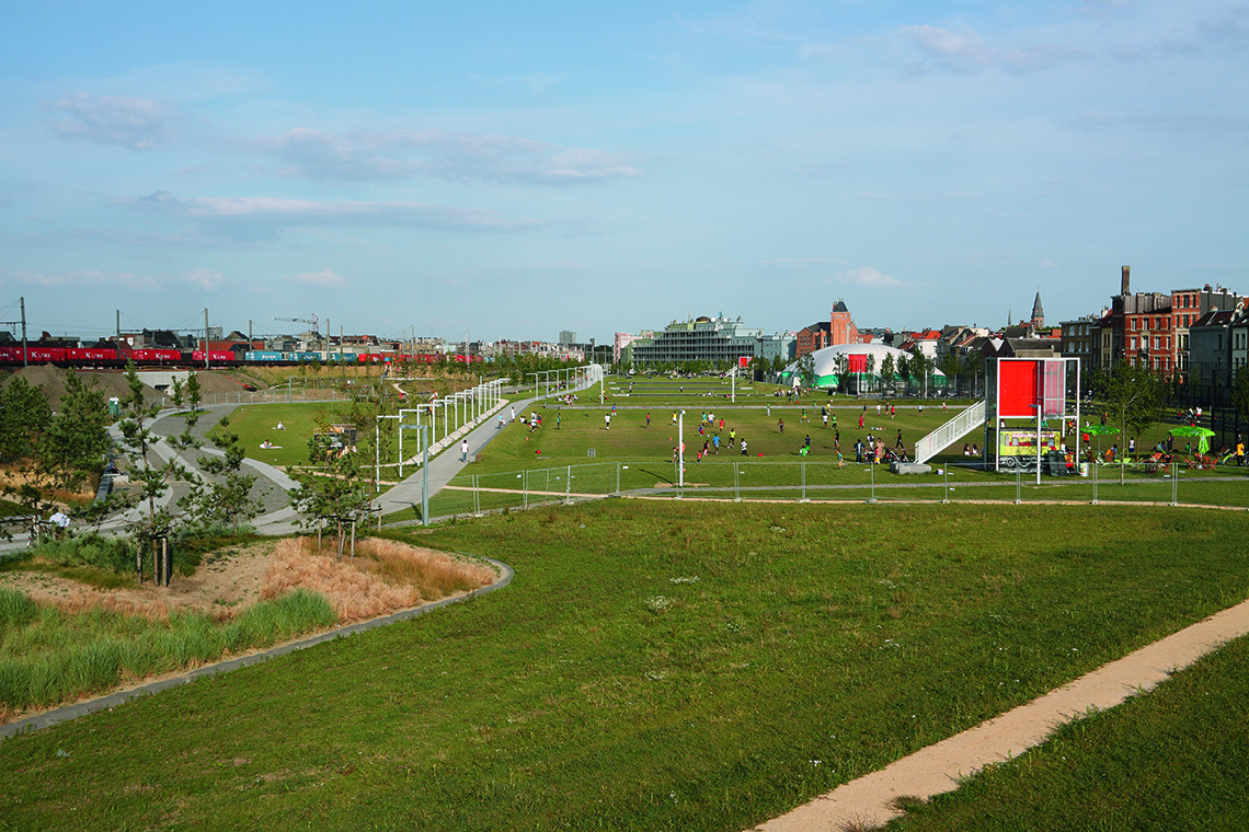 Nowadays a park is a «social space», a place for many everyday activities, a city part that can specially contribute to give a clear structure to the whole city and metropolis. The project for the new park in an area (about 24 ha) previously used by Belgian national rails is characterized by: -un uninterrupted space along the previous platform (1,7 km) to maintain the possibility of a connection (ecological as well as of communication) between Schelde river and the huge cultivated fringe spaces of the city. - the concentration of planned surfaces (200.000 m2 of housing, equipment’s, offices and commerce) in the west part towards the big boulevards. Two principles of implantation could co-exist at the same time: the campus (free objects in a park) and the tissue (the idea of an urban continuity). Here they are proposed as provisional conditions, with possible succession and not opposed to each other. Design of open spaces was conceived as in a constant natural evolution, in harmony with the process of implementation and life that will take place in it. - the integration of the two existing viaducts in a new topography that had also the secondary but important purpose of promoting the clearance of coal ashes polluted land.