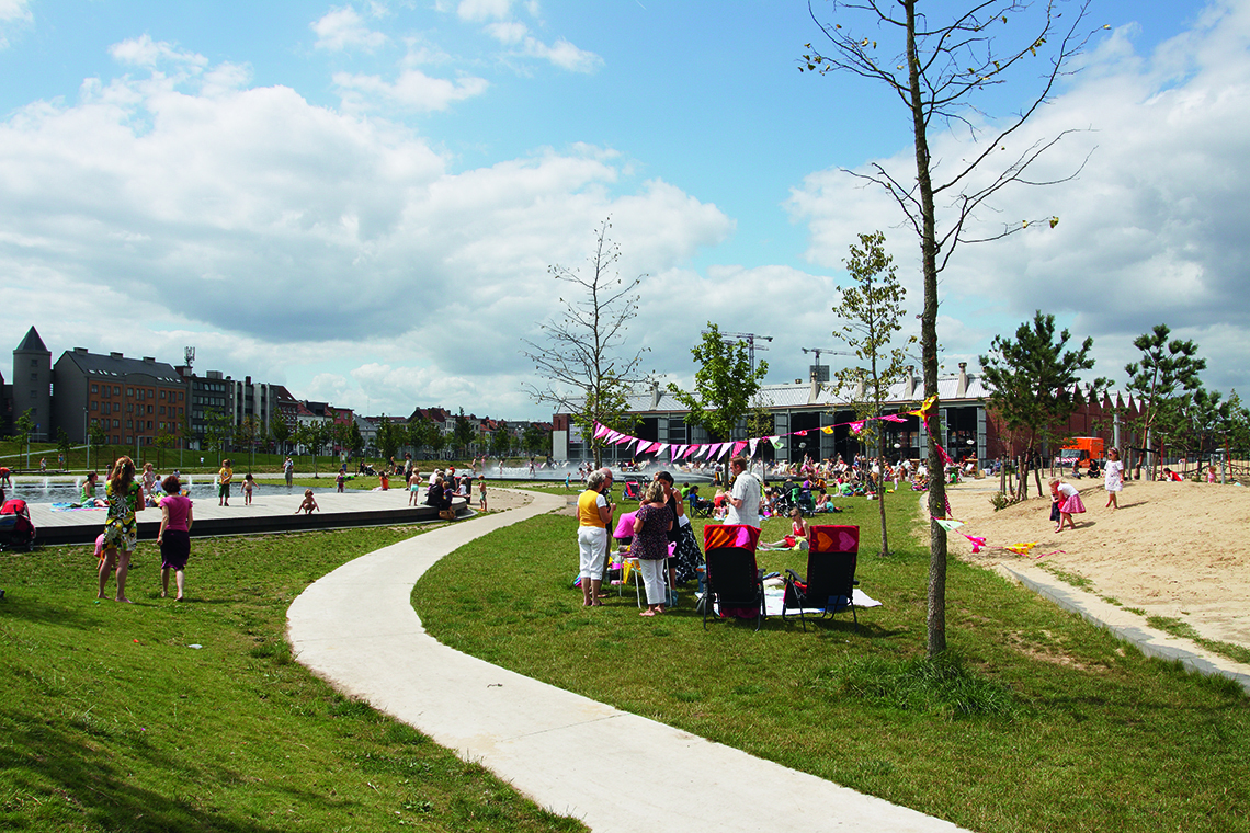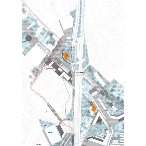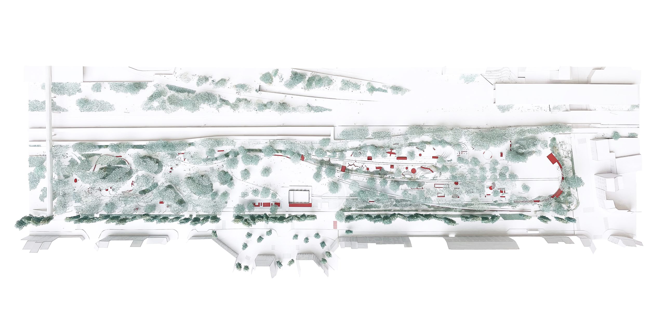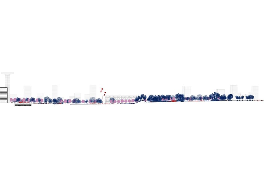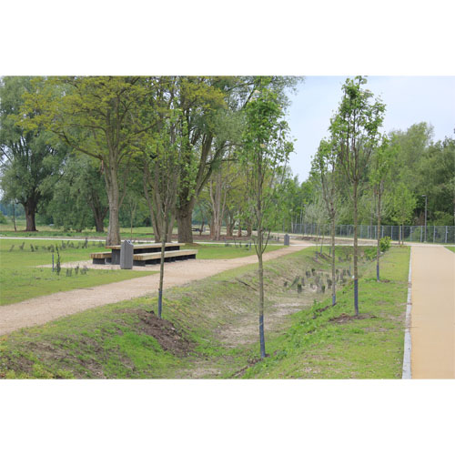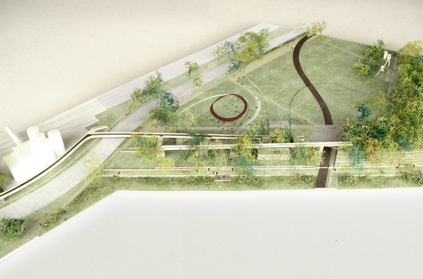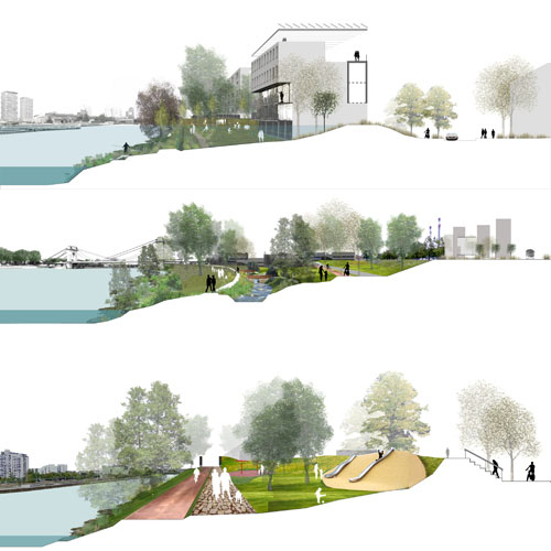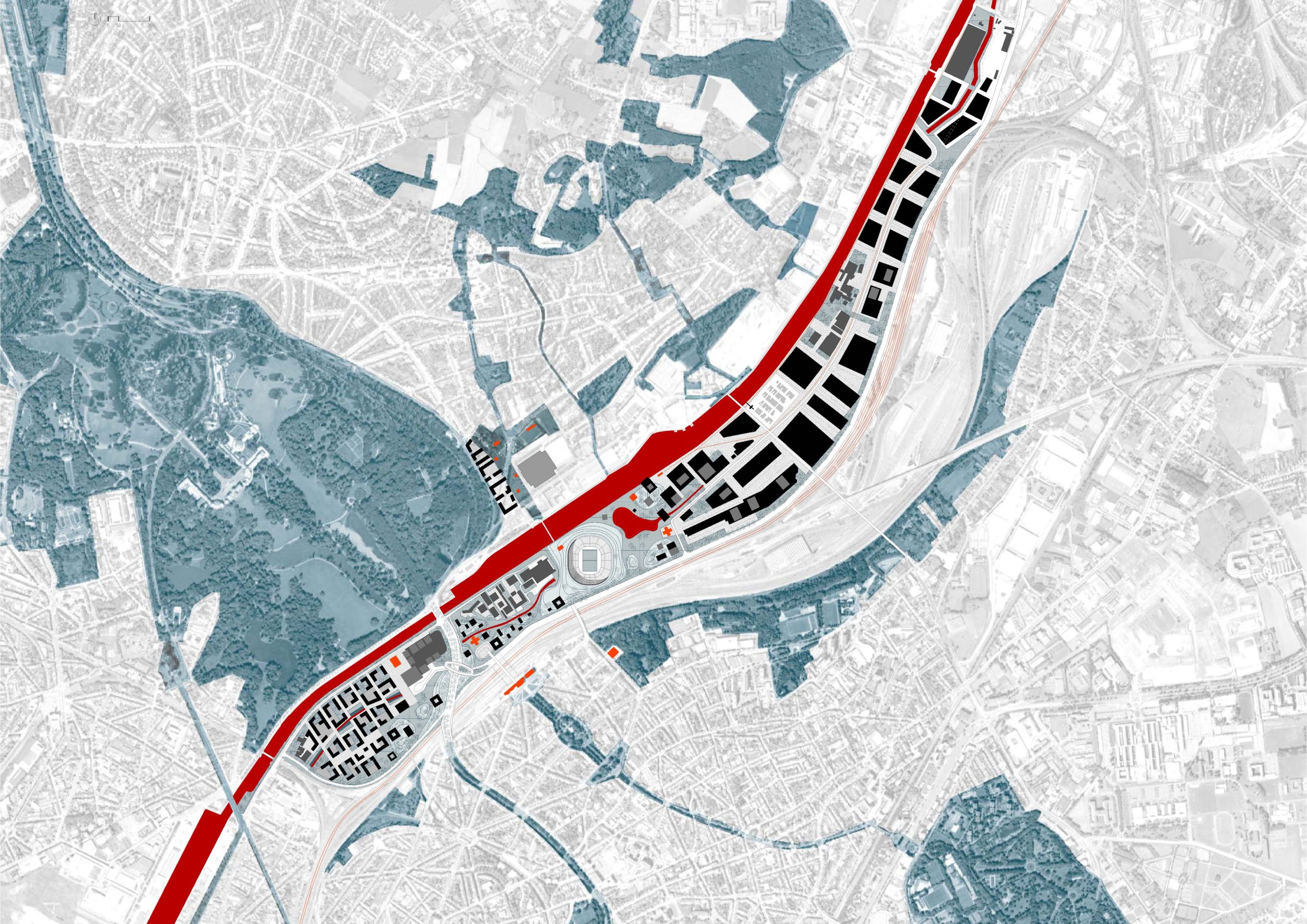 Nowadays a park is a «social space», a place for many everyday activities, a city part that can specially contribute to give a clear structure to the whole city and metropolis. The project for the new park in an area (about 24 ha) previously used by Belgian national rails is characterized by: -un uninterrupted space along the previous platform (1,7 km) to maintain the possibility of a connection (ecological as well as of communication) between Schelde river and the huge cultivated fringe spaces of the city. - the concentration of planned surfaces (200.000 m2 of housing, equipment’s, offices and commerce) in the west part towards the big boulevards. Two principles of implantation could co-exist at the same time: the campus (free objects in a park) and the tissue (the idea of an urban continuity). Here they are proposed as provisional conditions, with possible succession and not opposed to each other. Design of open spaces was conceived as in a constant natural evolution, in harmony with the process of implementation and life that will take place in it. - the integration of the two existing viaducts in a new topography that had also the secondary but important purpose of promoting the clearance of coal ashes polluted land.