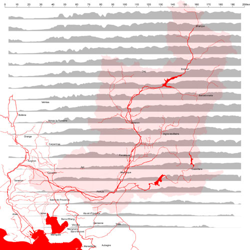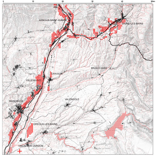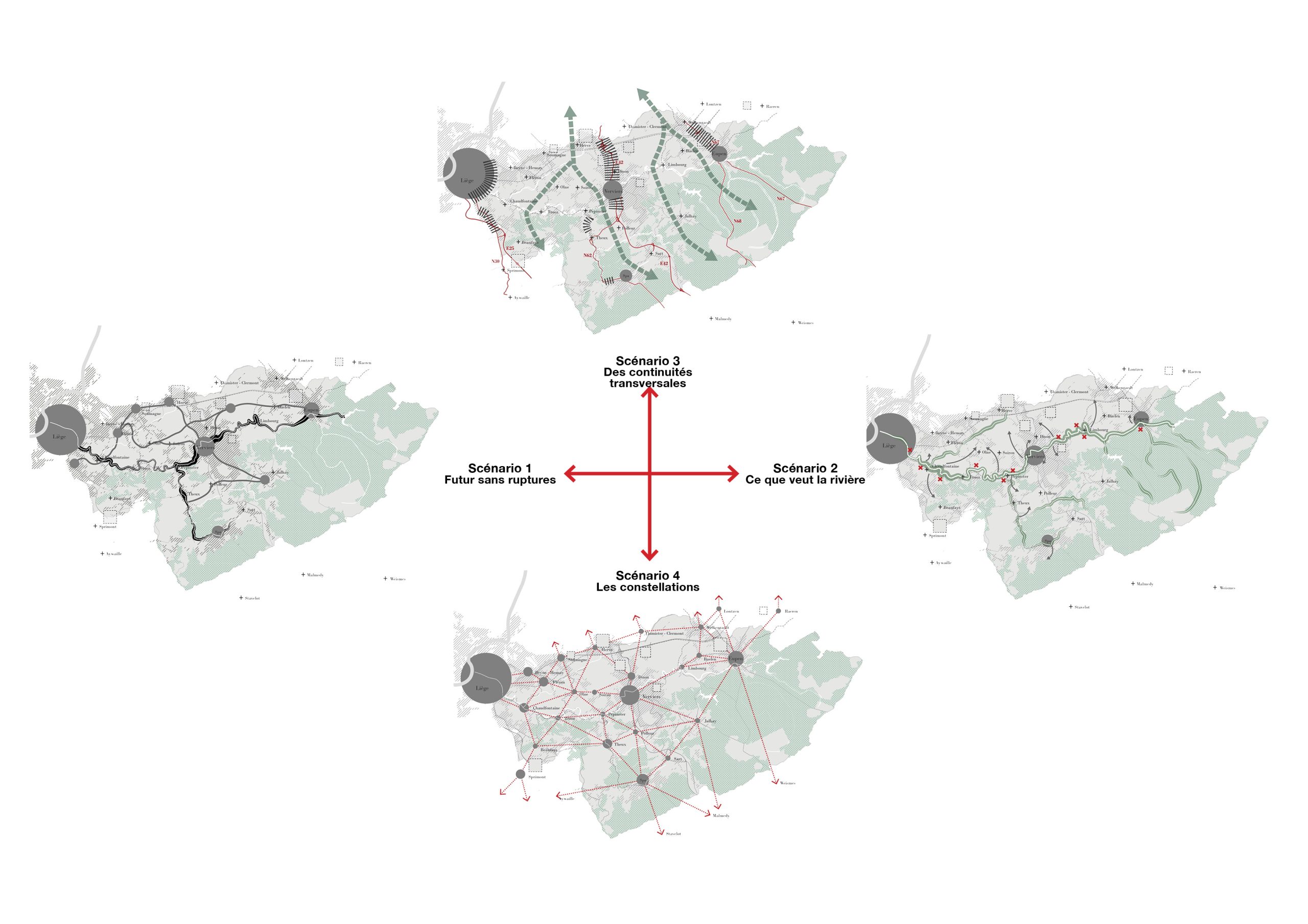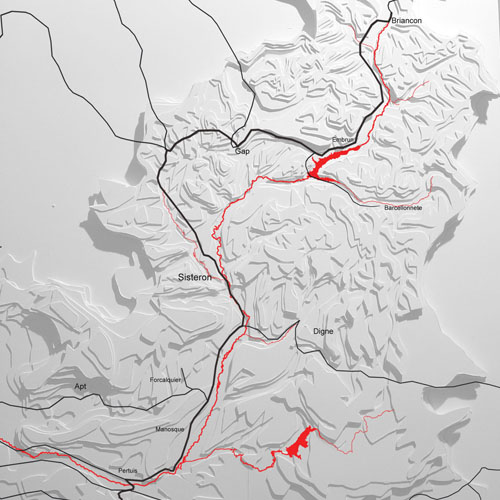 Build a territorial project is a great opportunity to question our idea of future, to apply the test under different scenarios and to propose such a vision that aspires to become collective. The idea of a new modernity, specific and not generic, we find appears in the image of Val de Durance as reservoir, wider than that of the valley scale, a point of strength and leverage project. Thus, the hypothesis of Val de Durance as water tank at the regional level, renewable energy at the national level, biodiversity at European level, scientific innovation on a global scale is an image project. It directs and may guide the selection of places and strategic actions. If the issue of agriculture is taken as an example in an " agropolitain " territory we can already begin to imagine actions inspired by Cassini hypothesis and strengthen several aspects of the "reservoir " as take advantage of the diversity of dry areas and irrigated and distribute new acreage consistently sectors maintain and develop agro-ecological structures, hedges, open spaces, the meadows, the vegetation of "water" etc. The strategy for the development of this spatial vision involves constructing an image of the project, which is here the tank, and the implementation of scenario. The image of the reservoir is a critical picture. Perspective, a perspective that allows us to cross territorial thickness of critical and reflective way. While the scenarios are more like a collection of assumptions, the possible consequences are explored. So, we have not developed a " run of river " scenario in the traditional sense. Instead, we started thinking on the basis of the establishment of a "zero scenario". One that starts from the consideration of projects: this is, in our view, the base of one possible future, one that is already in assumptions change and change in progress or offered on this territory. Besides the zero scenario we developed two other tracks: The hypothesis radically strengthens transit and territorial consequences of the ITER project. Large external projects, such as ITER, the effect is not a fundamentally new phenomenon in so far as the valley grows and changes, today as in the past, through a series of shocks externally driven. However, the scenario of urbanization along the valley raises important questions with respect to agriculture and biodiversity therefore need to be thought together with the integration of the infrastructure.