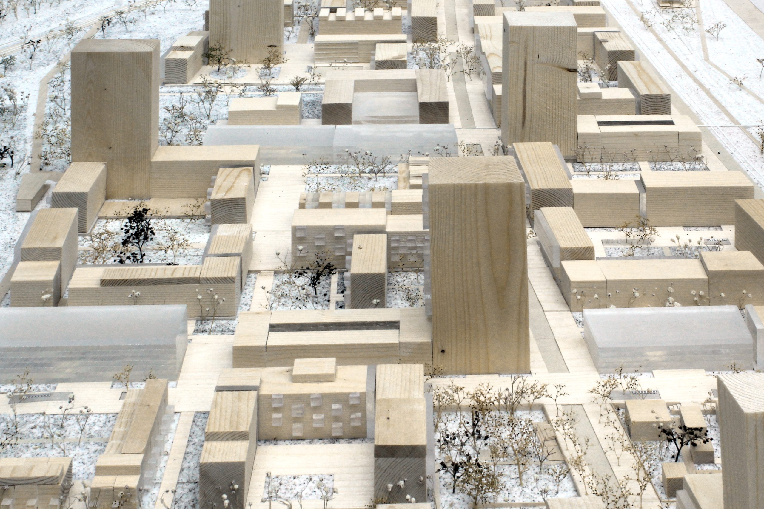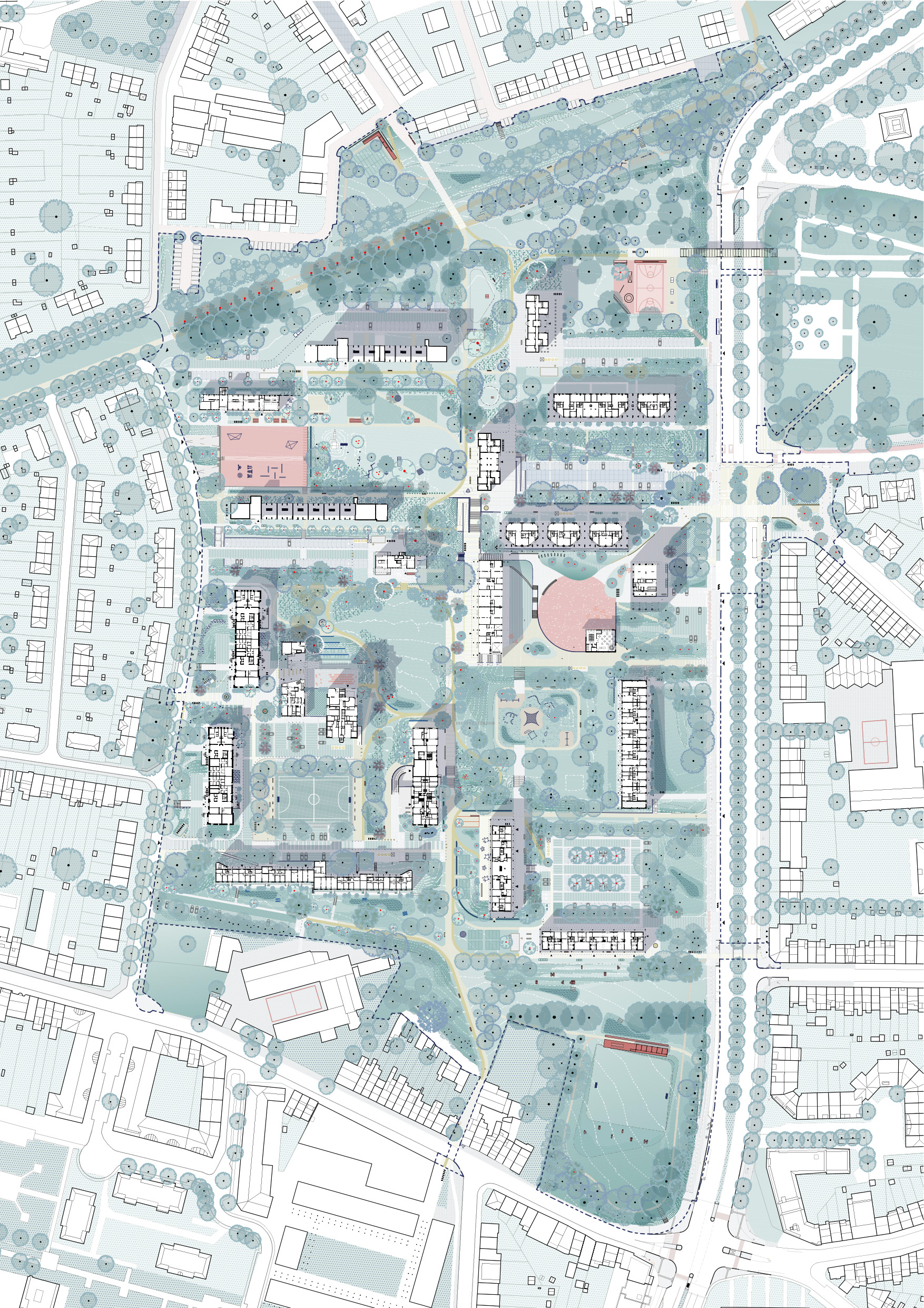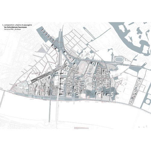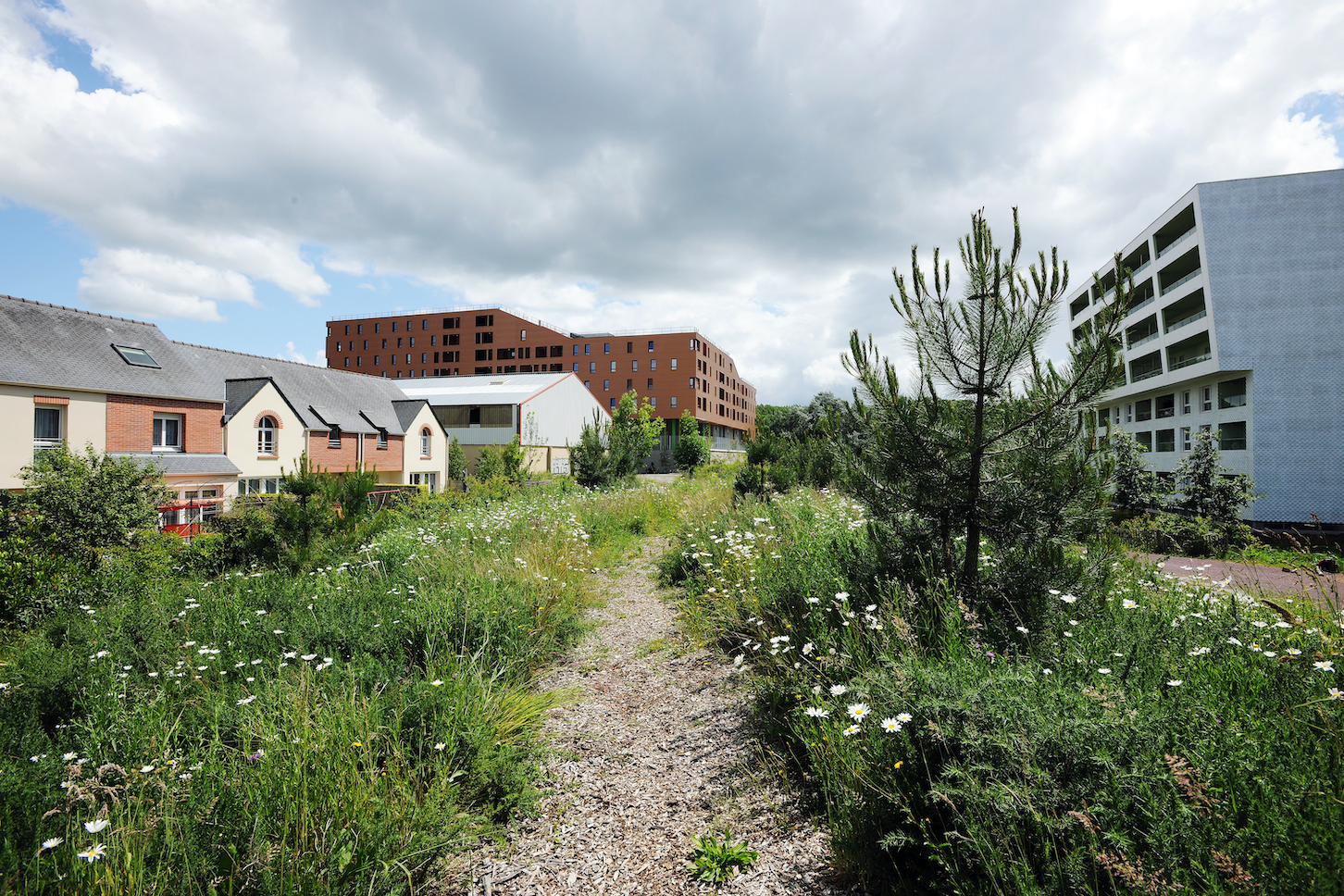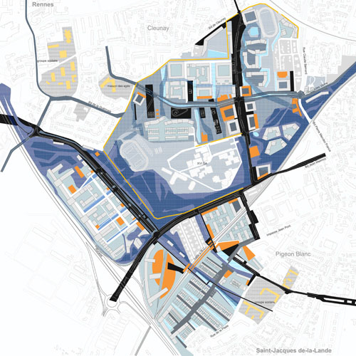 Rennes, Brittany region capital, is a fast-growing city and, as a consequence, is subject to a strong housing and equipment demand. The query of the assignment was for a new city part design (140 ha, 4500 new housings, 100.000 m2 of service, the necessary equipment…) in a previous military area characterized by an important natural asset. Based on a careful observation of places and topography, the project claims the necessity of considering the different ways and styles of life and mix them (''mixité'' concept); it considers the orientation of different buildings and their projected shadows, first step for an in-depth study of energetic problems. That's why this peculiar project stands up against the rhetoric of iconic architectural solutions and try to give an answer to the functional, social, and visual complexity of contemporary society. A project of this scale, that mobilises a number of actors and means, cannot be realized in a short time; it requires a flexible and strategic approach that allows a phase implementation. For these reasons parts of the project are conceived as definitive, for example the design of the open spaces giving a strong structure to the urban space, other parts, like buildings and private gardens, as more flexible units, where future changes can happen. In the first case the project principal element is the 'green stream': a system of large open spaces that links the centre of the city to the country side through the Courrouze area; in the second case it is the sequence of private spaces, semi-private and public gardens: the patchwork of mixed uses placed side to side with the different building types.