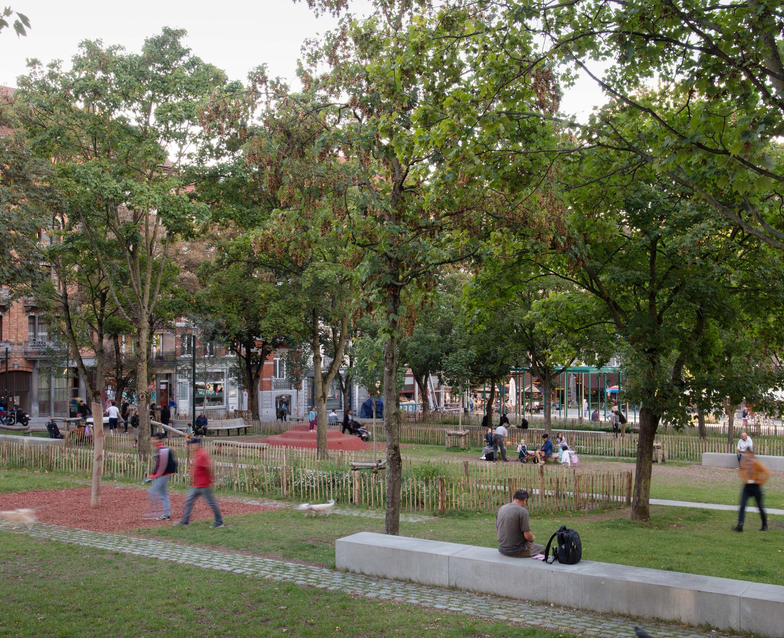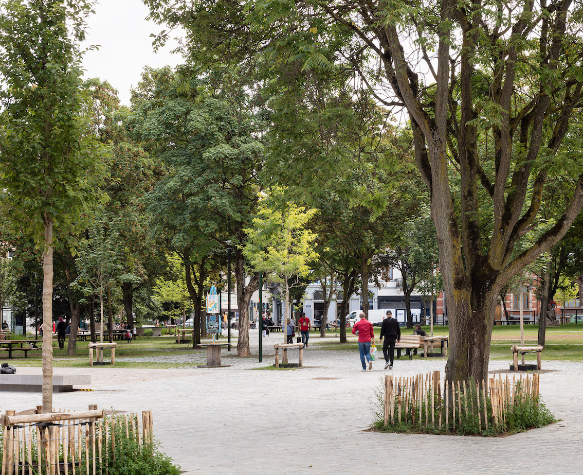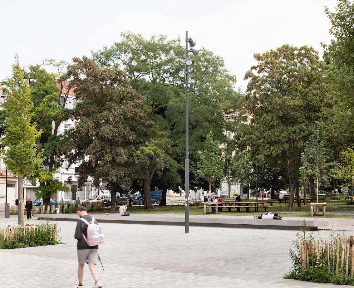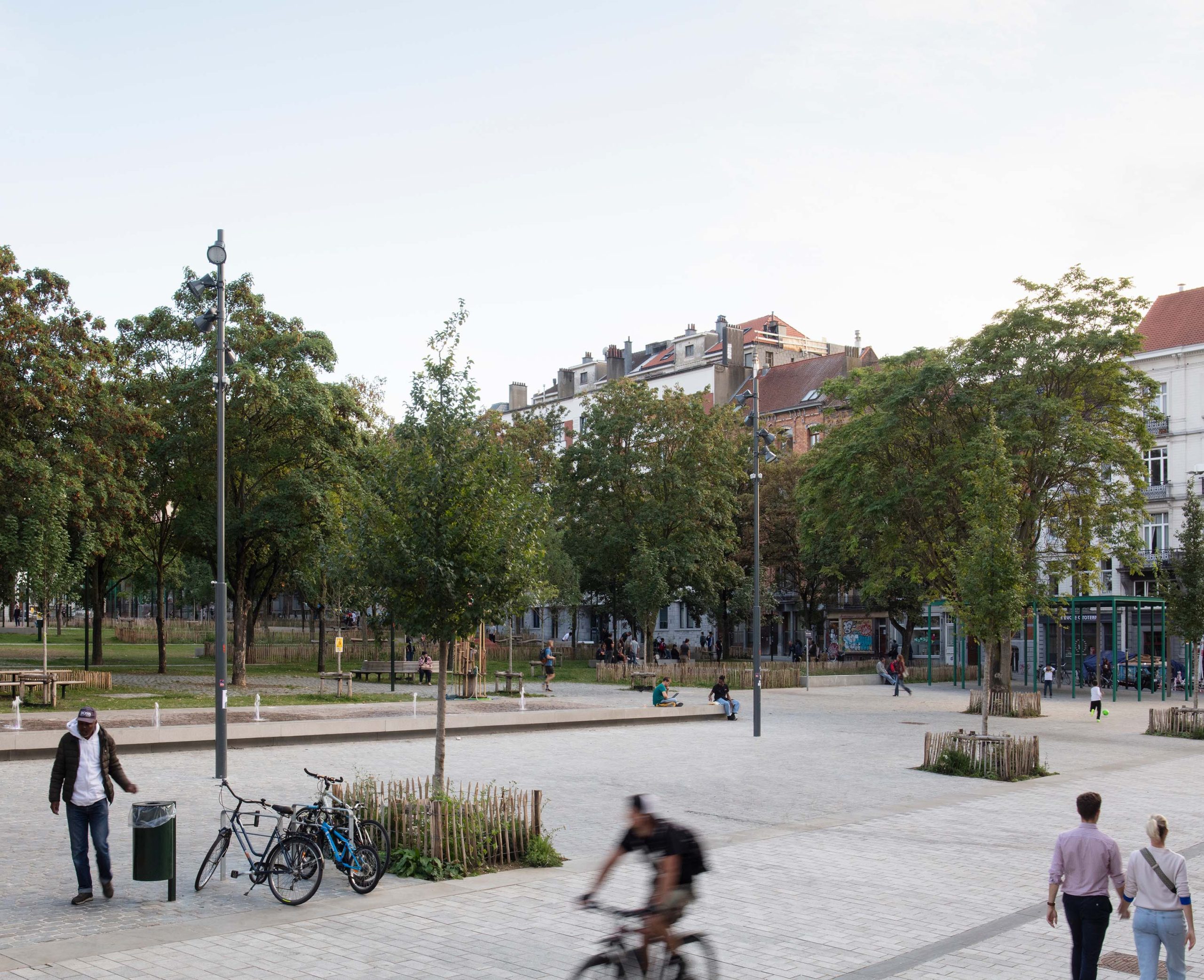 The Square Marie Janson is part of a sequence of large public spaces on the slope of Saint-Gilles. This project aims to translate from reflections on the soil of the city, the various questions raised by the public space of today and tomorrow, particularly on the aspects of water, pollution, car space, reuse of materials and uses. It is a long-term approach, which has defined this park as being designed for a century, capable of integrating the different evolutions of time.