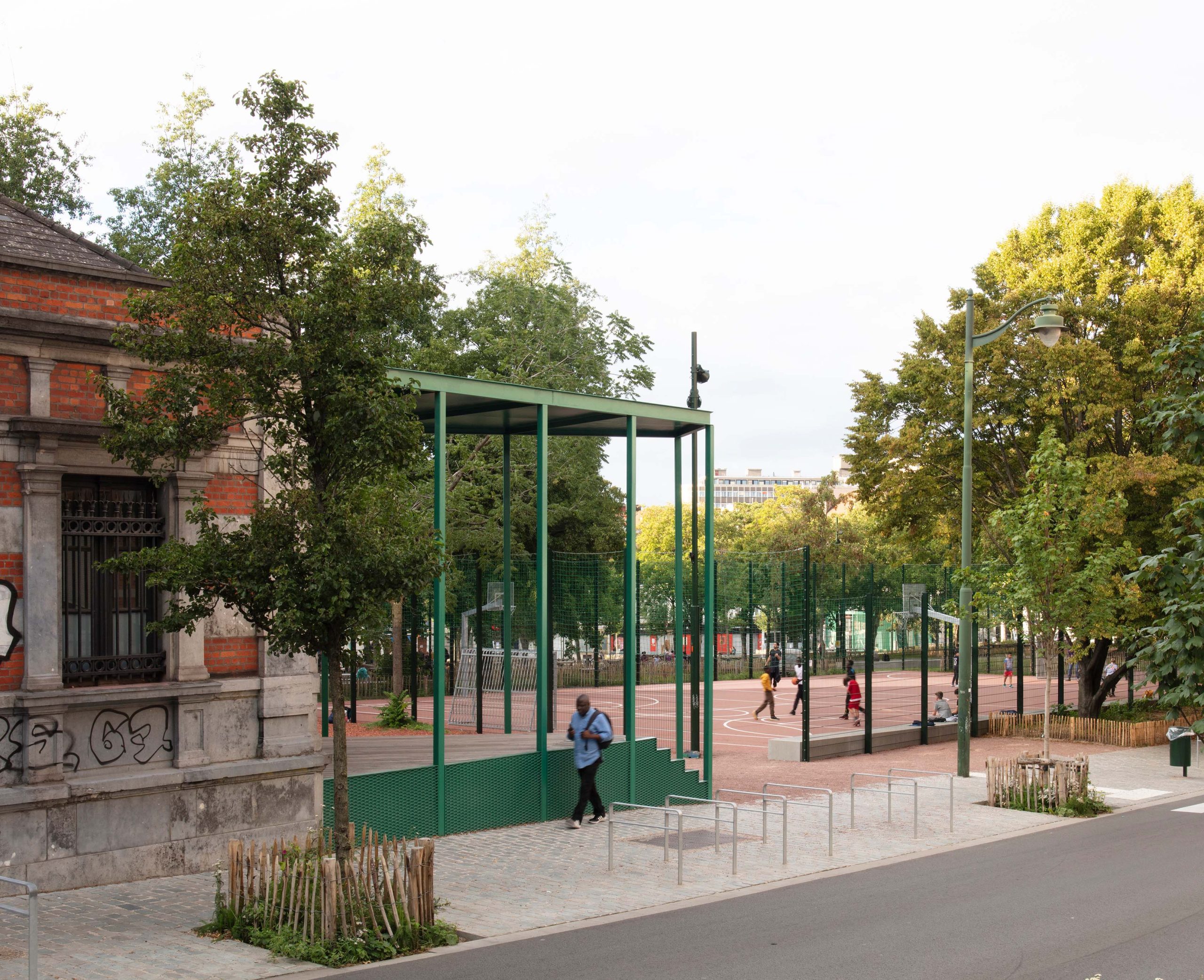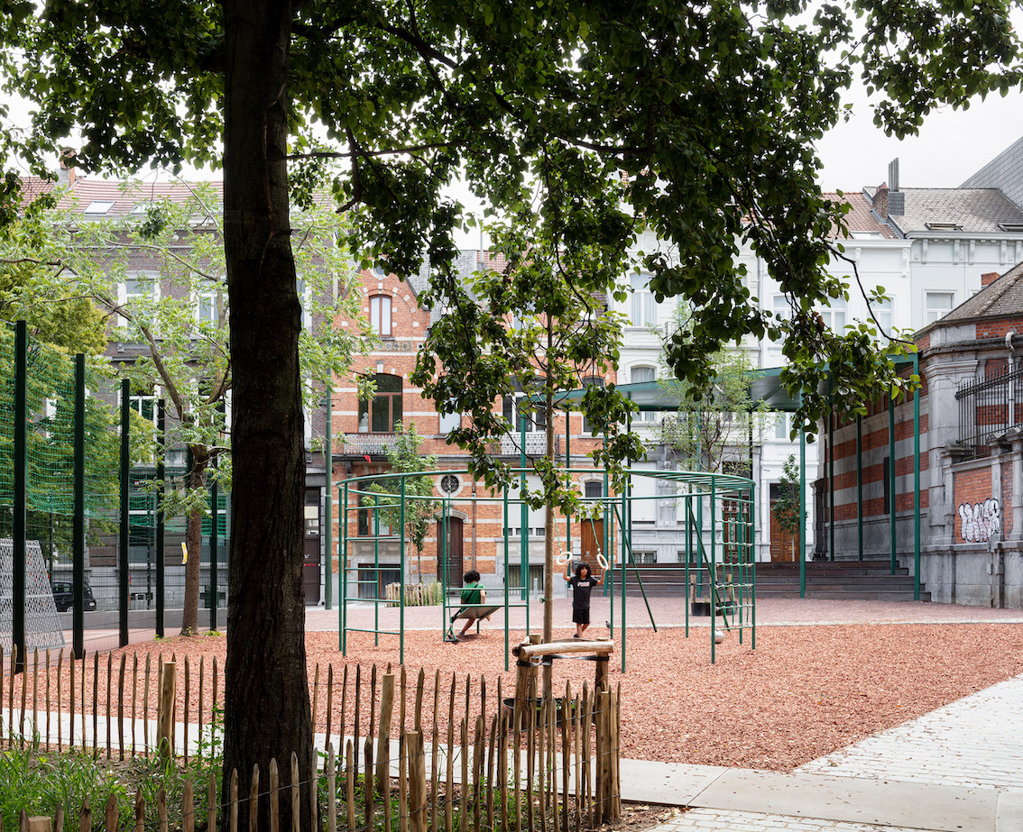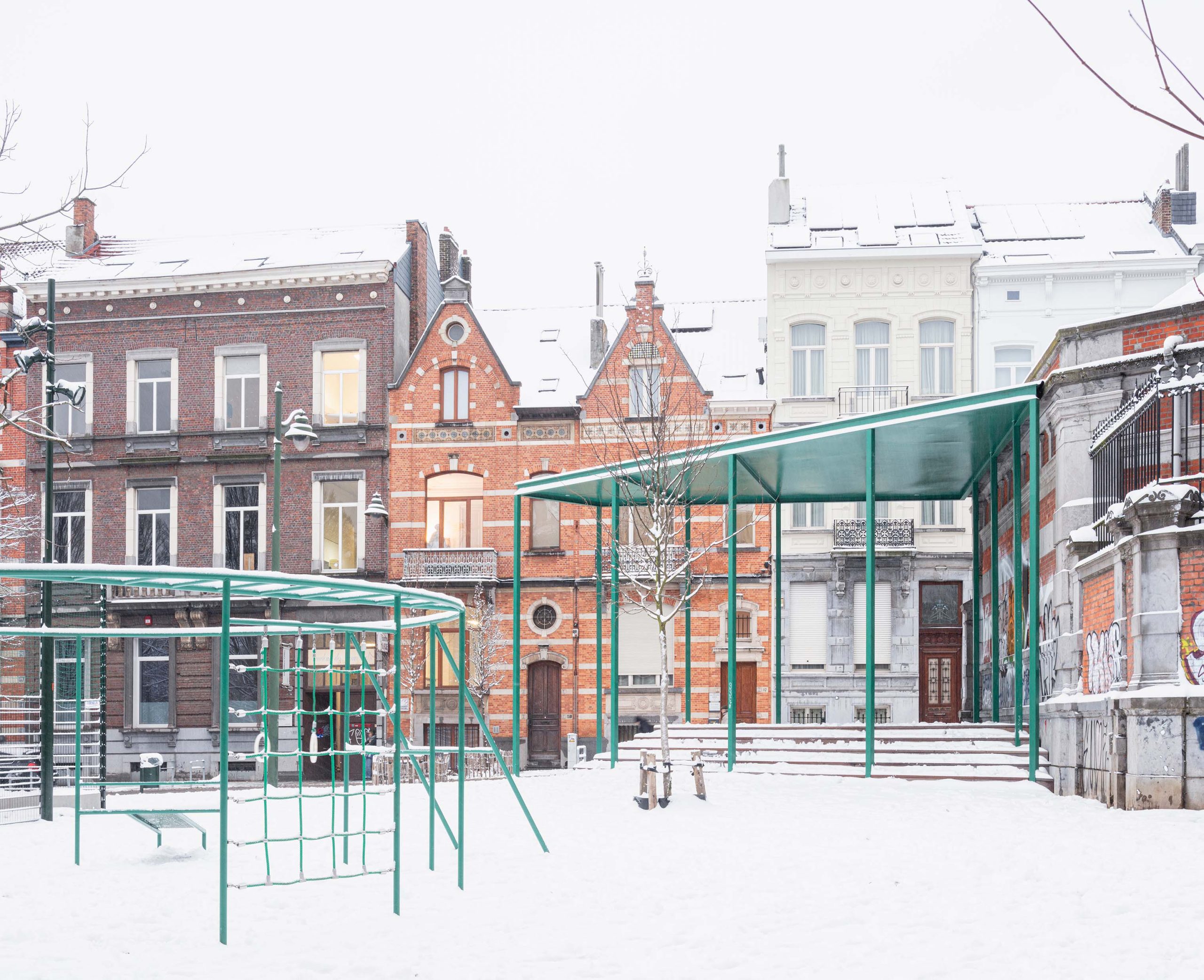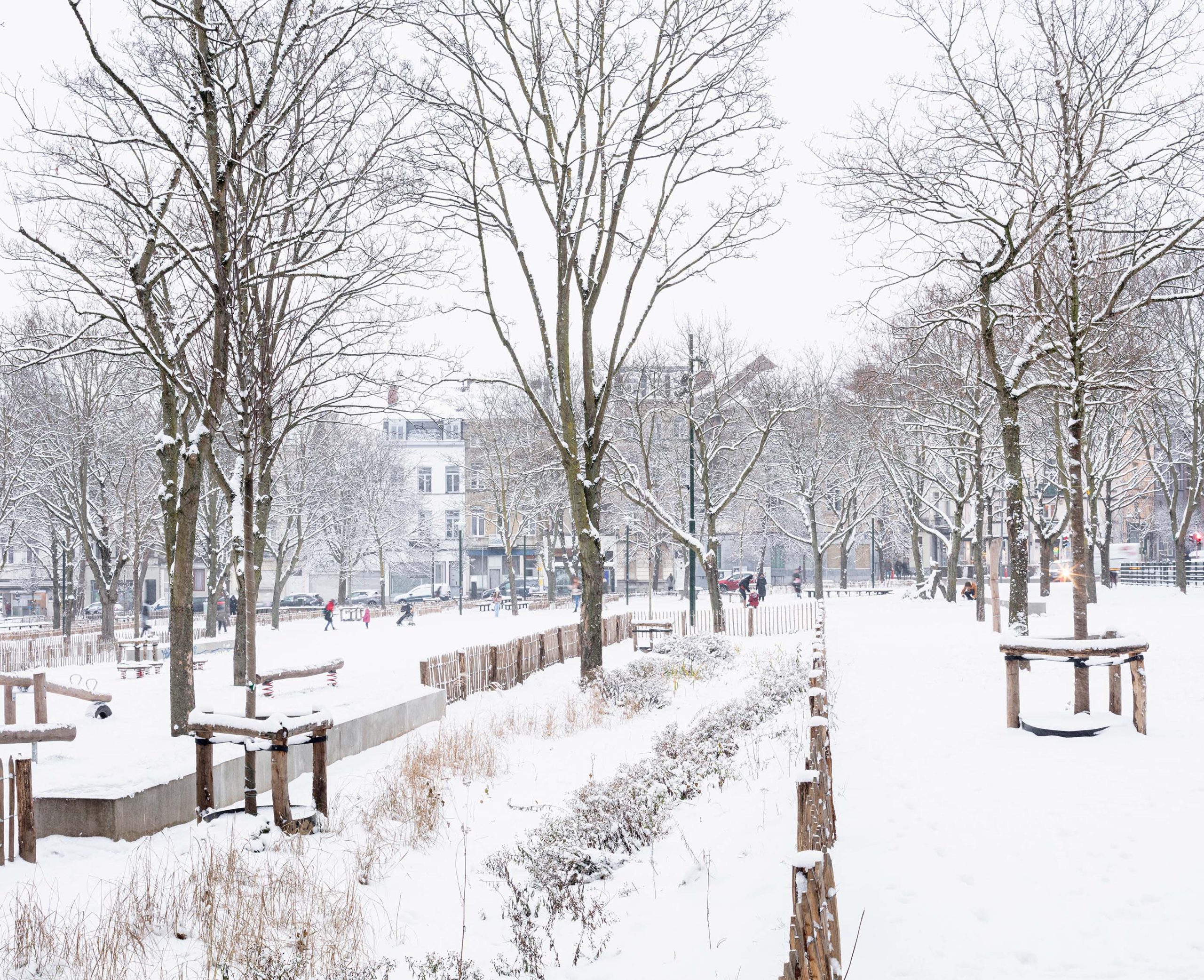 The Square Marie Janson is part of a sequence of large public spaces on the slope of Saint-Gilles. This project aims to translate from reflections on the soil of the city, the various questions raised by the public space of today and tomorrow, particularly on the aspects of water, pollution, car space, reuse of materials and uses. It is a long-term approach, which has defined this park as being designed for a century, capable of integrating the different evolutions of time.