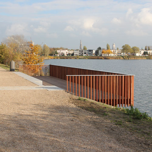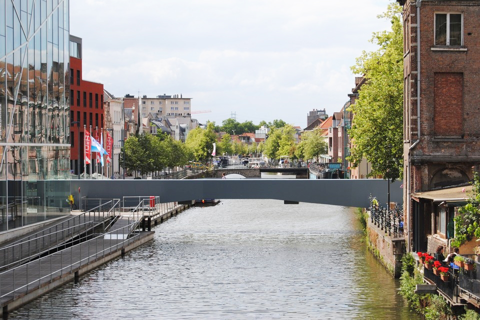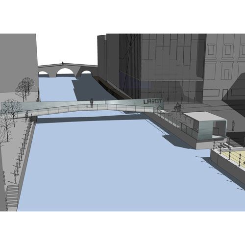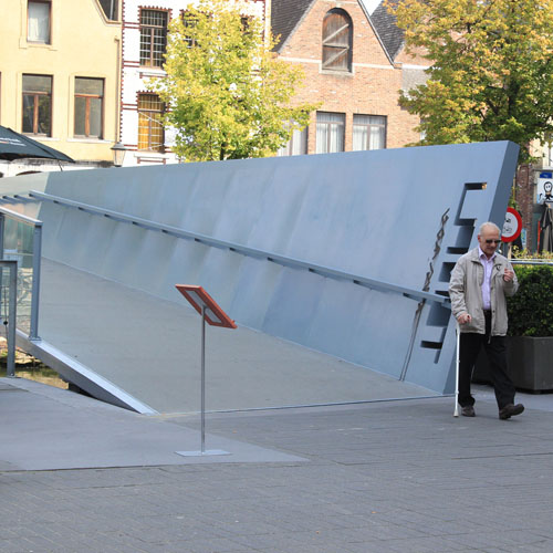 The project Lamot bridge is not considered a simple connection between the two banks of the Dyle, but as part of the wider strategy for renovation of Mechelen. In this sense and also from a symbolic point of view, the bridge is part of an important link between the Lamot site and the historic centre. These reflections on a large scale are joined by others, explicitly related to the configuration of the site. The project of public space has created a connection in a heterogeneous area is characterized not only by a multitude of features and social practices, but also by a strong fragmentation. In particular, the need to design with the goal of creating such an open space and readable as possible, led to a series of compromises, like in the first place the need down the level of the place that hindered the possible relationship with the Dyle. the Lamot site and the fish market are perceived in other words, if two extensions of the Dyle, rather than two different places: the deck and pavilion providing centrality to space and back to the water. Both objects are designed as two terraces cantilevered over the water, as two homes. Strong heterogeneity in terms of shape, colour and style of existing buildings brings us to the use of a very discreet architectural language. The soil is a little bent, black concrete surface. Similarly, the bridge and the pavilion are two surfaces of folded steel. The bridge is an extension of the road Stoofstraat, where a slight crease directs it to the space instead.