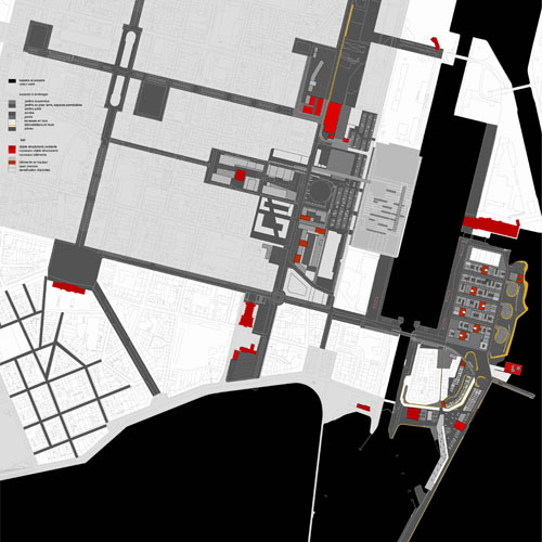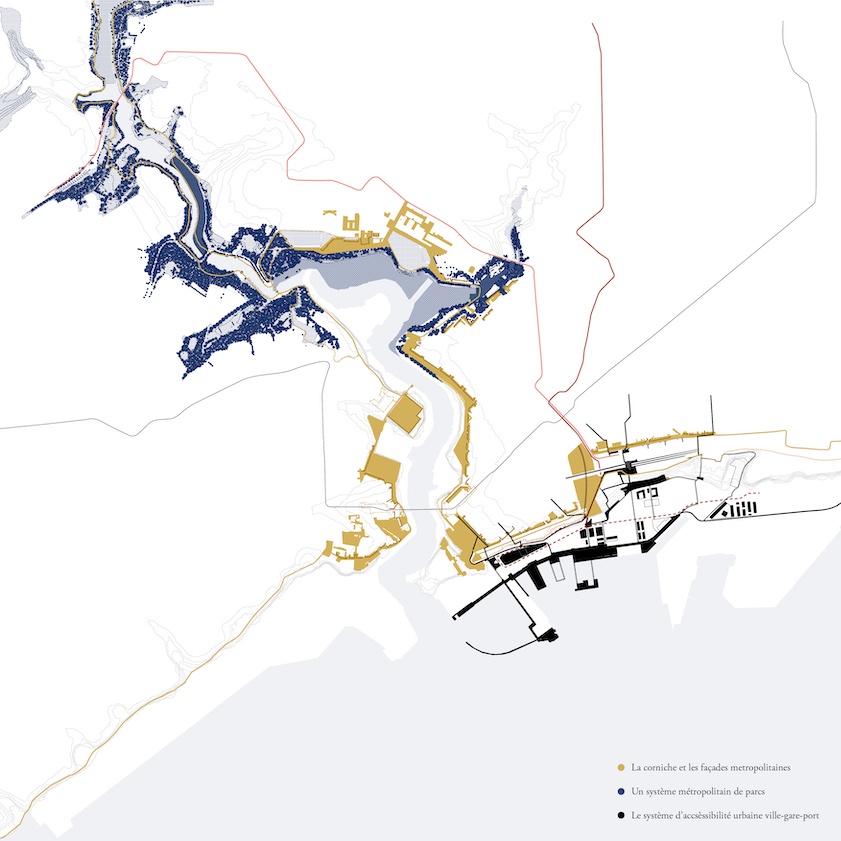Saint-Nazaire, completely destroyed during the World War II, was re-constructed in a rational, but rather trivial, way. The project has the ambition to propose a strong image based on the reappropriation of 'mythical' places from the past, when Saint-Nazaire was the departure port of steamships to America. The project became a reflection on the three identities of the city. The identity of port city, which means the city in the past that was destroyed due to the presence of a Nazi submarine base; the identity of a specific place, the rock 'du Petit Maroc', heart of the city; the identity of relations, the Nantes - Saint-Nazaire metropolis, which is defining a new dimension of the city and the territory and their mutual relations. We propose a scenario of renovatio urbis for these reasons, which means a series of punctual operations that has the force to modify the wat the city 'works' as a whole and the role of a single part of the city apart from the whole city. The presence of the city cultural centre in the old station, of the open-air museum on the roof of the submarine base, of the new commercial centre in the block of “Maison du people”; of the contemporary art centre in Petit Maroc with the development of a new part of city on the port platform...They all add to the existing urban structure with complex places that strengthen its simple structure. The network of public spaces animated by these operations define a new vision of the city of Saint-Nazaire.