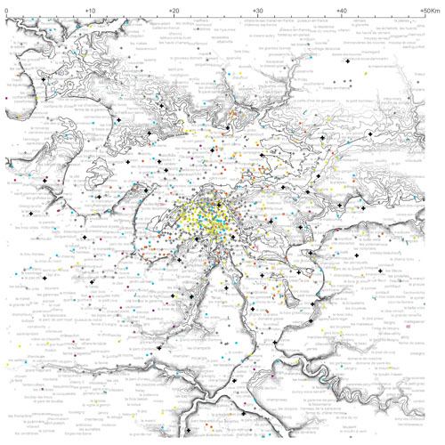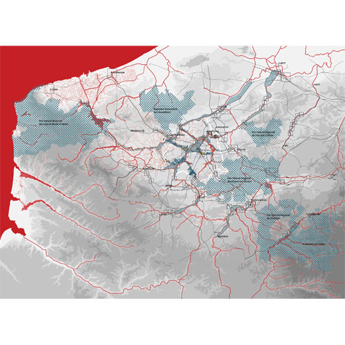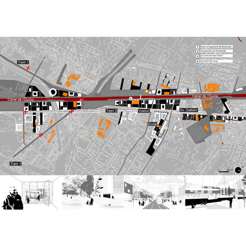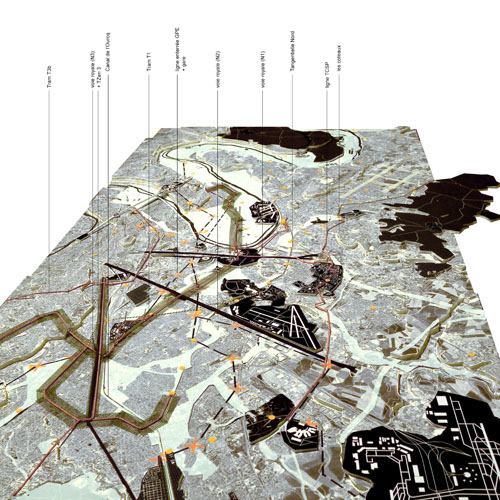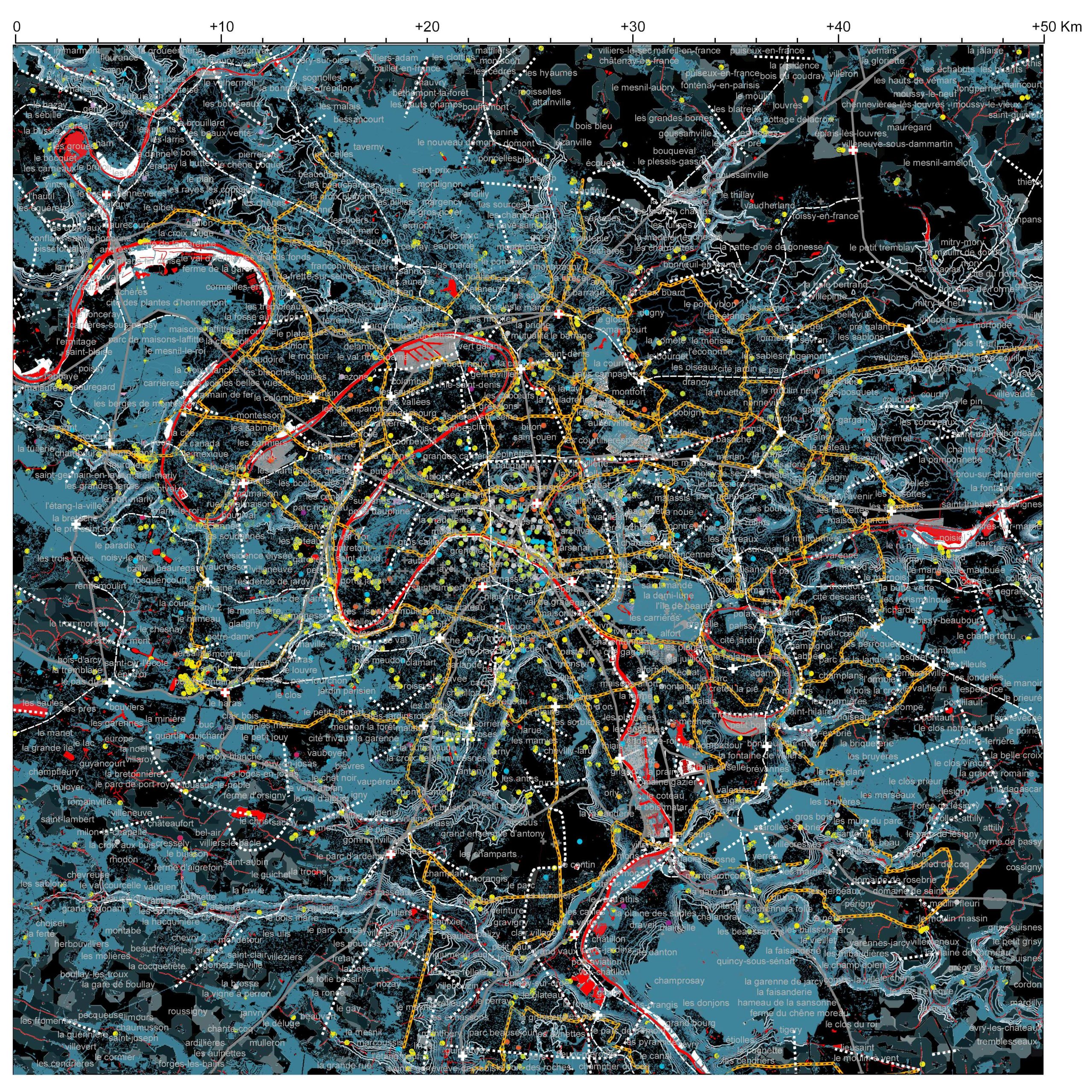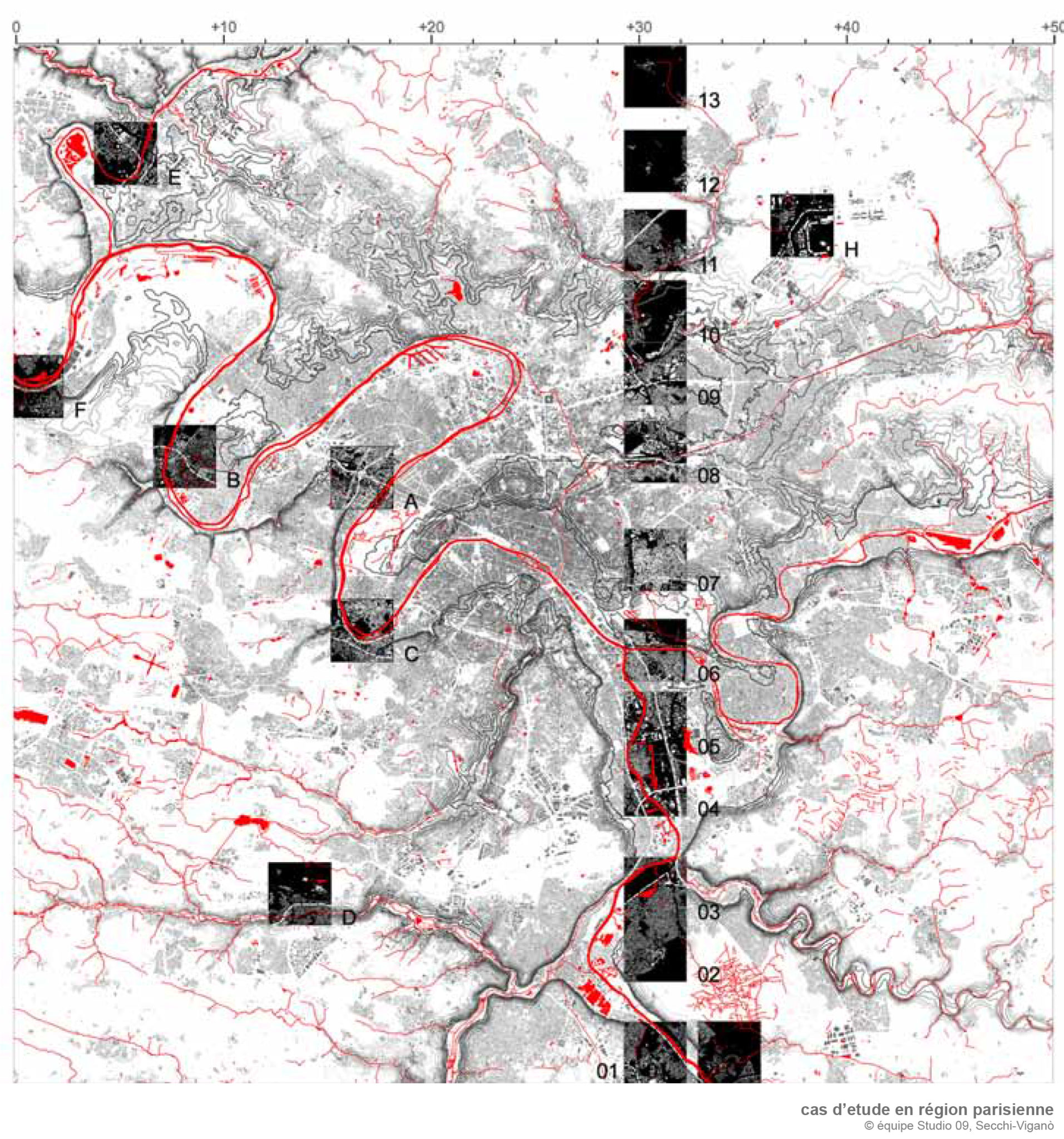 The study on Great Paris Region ‘’the porous city’’ is divided in three parts. The first part, a knowledge strategy for XXI century -the after Kyoto age- metropolis, makes clear our approach to figure out contemporary metropolis situations complexity and depict a possible future. Studio followed here this pattern: Paris, as others metropolis, will have to face, in the future, some important issues. This drives to the need of considering and build different ‘scenarios. We made a comparison with other metropolis through common criteria, specifying Paris diversity; not drawn only on long time fixed icons. Great Paris is neither only a main tourist venue, nor the mental images Paris inhabitants have of their city. A trial for a new approach study was our guideline. The second part illustrates three different scenarios we consider fundamental for the XXI century -the after Kyoto - metropolis and its future. The 1st scenario took as a model a future of 100% durable energy situation; the 2nd scenario envisages the creation of a new great wetlands system in the metropolitan area, aiming at a composed ecological and recreational system starting from the ‘dross’ biotic system, and how this system could deal with metropolitan risks which includes environmental, social and economic crisis; and, at last, the shift from a hierarchical vertical system to a horizontal isotropic mass transportation system. During the scenario construction, we have been collaborating with experts, artists and EMU students. A large number of interviews, micro-stories, photographs, analysis and design have been done in Paris to root the scenarios deeply in this vast territory and its inhabitants. In the third part, finally, Studio proposed strategic projects, interacting with the three scenarios.
