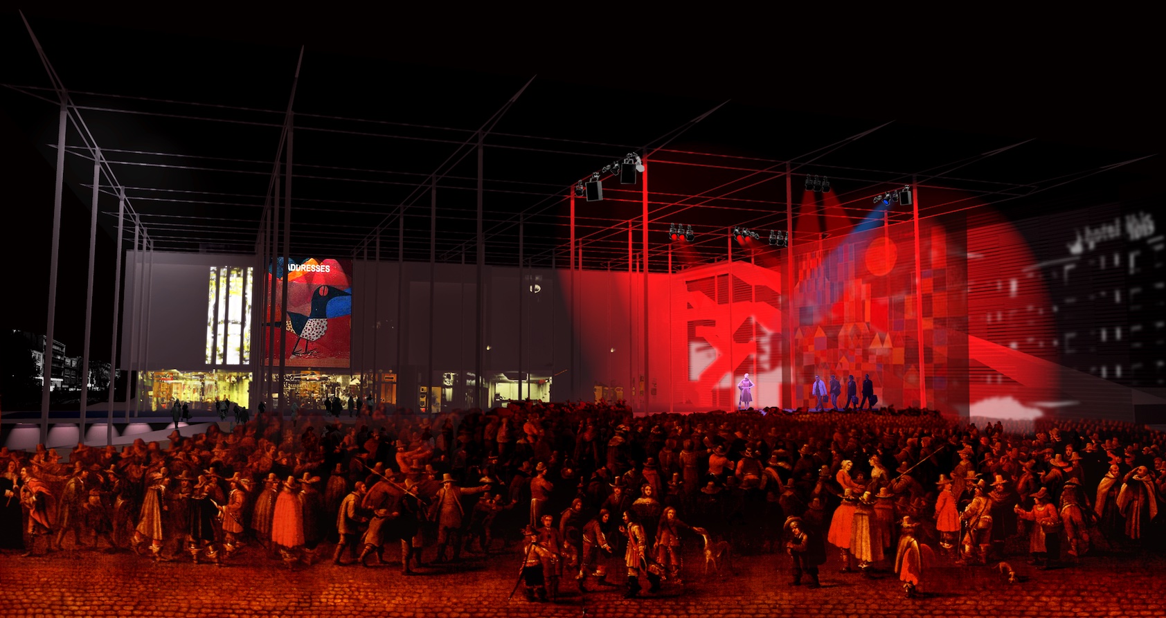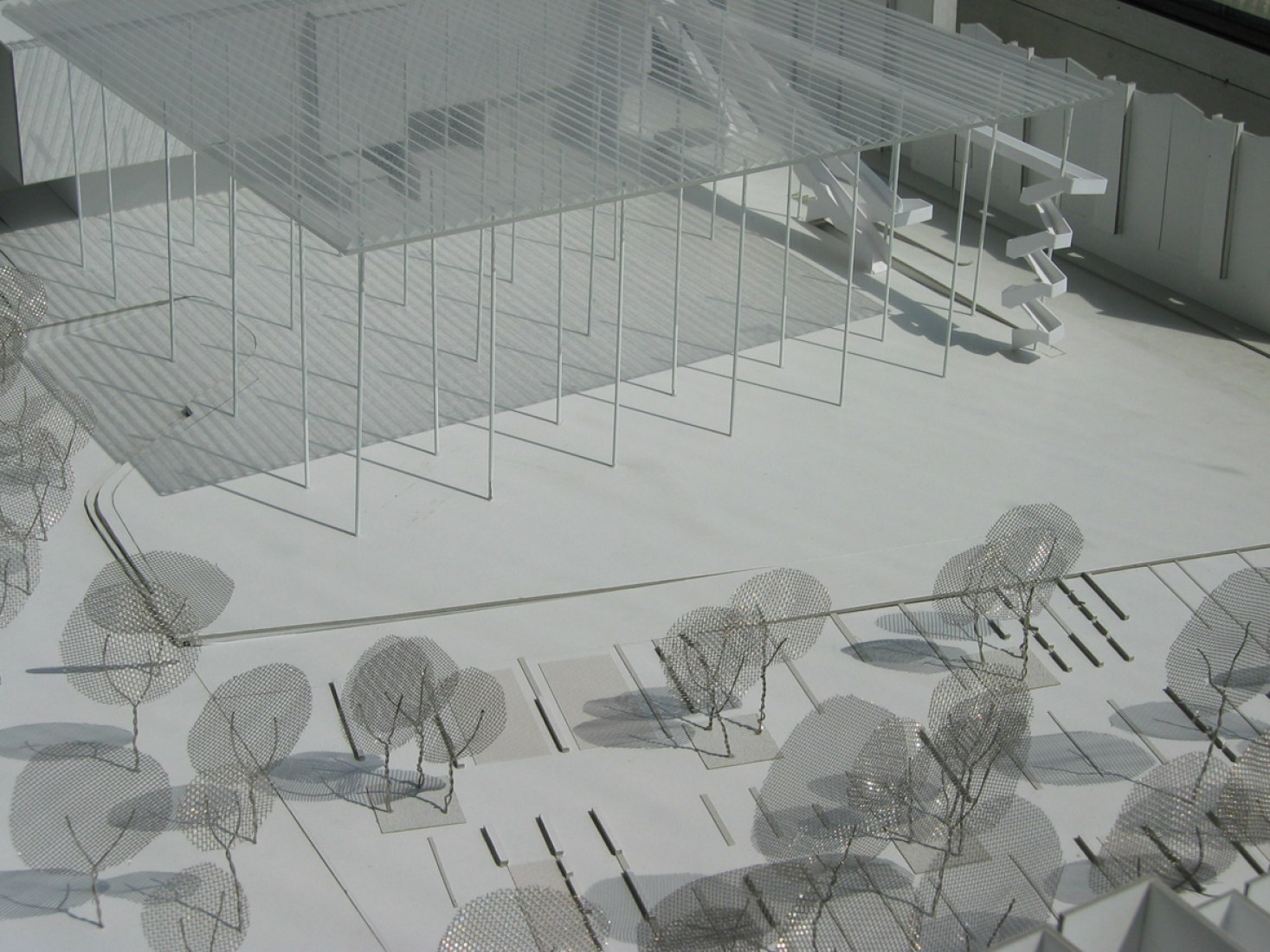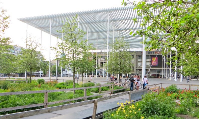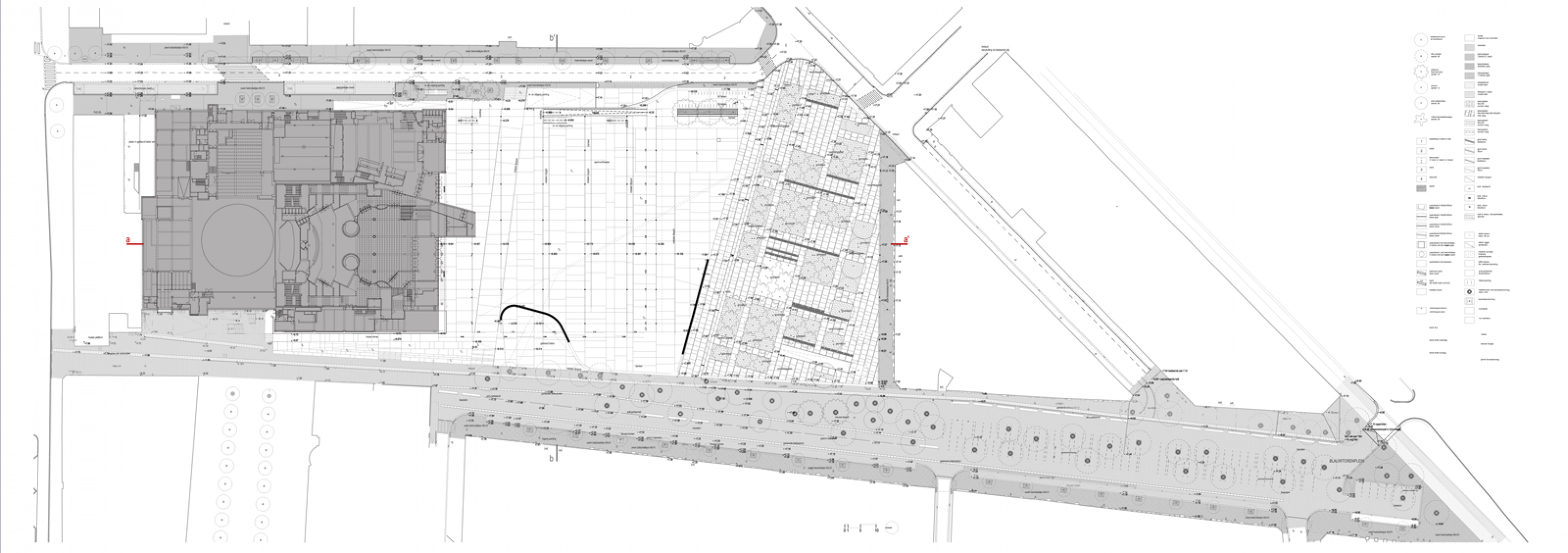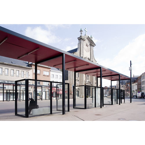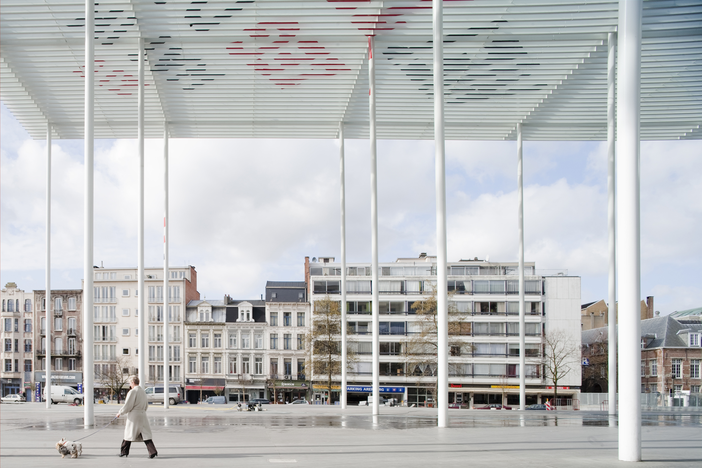 Today, the Theatre Square in Antwerp is a boundless space, where it is difficult to calculate the distances and to find one's bearings: a space without limits. A huge space, even if disproportional, should not be necessarily filled up and built; it should be correctly interpreted in the visible and invisible measurements which are usually the product of the site's history and of the different choices taken on it. The project articulates the square in 4 major spaces: the garden in the south part, a covered square in the north part, the mall at the west side all along the Oudewaart square and an equipped space at the east along the Meis street. The gardens become an area for infiltration of rain water. Between the garden, conceived as a playground, and the façade of the cafés and bars a platform in wood becomes a multifunctional space. The design of the square, in coloured concrete, eliminates all the existing barriers: accessible to everybody, the square becomes a whole surface, 2% of ramp, which links the entry of the theatre to the very nearby boulevards. The margins of the square have a different design according to their character: along the Maria Pijpelincx street, Graanmarkt and Oud Waart square the existing pavement and trees were maintained; along the Meis street the entry at the underground parking was reorganized, along with the bicycle parking and the bus stop. A part of the square is covered: the cover, supported by a very slim steel colonnade, makes the space comfortable for the weekly market. The existing security stairs are demolished and substituted by new ones which creates a virtual façade of the covered space towards the Meis street.