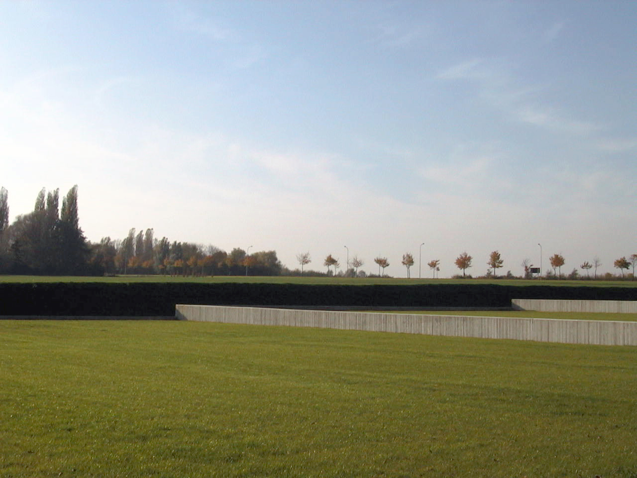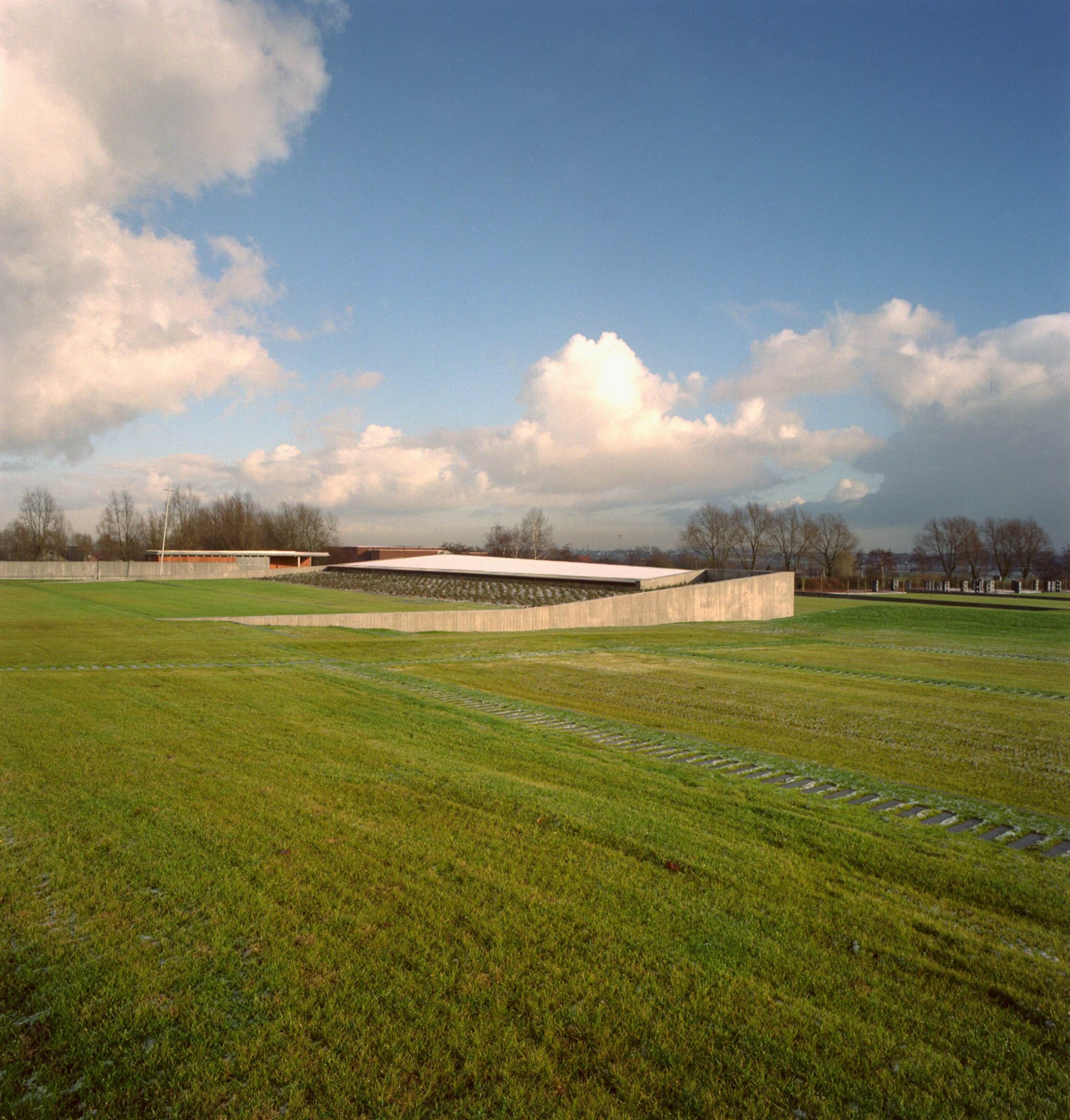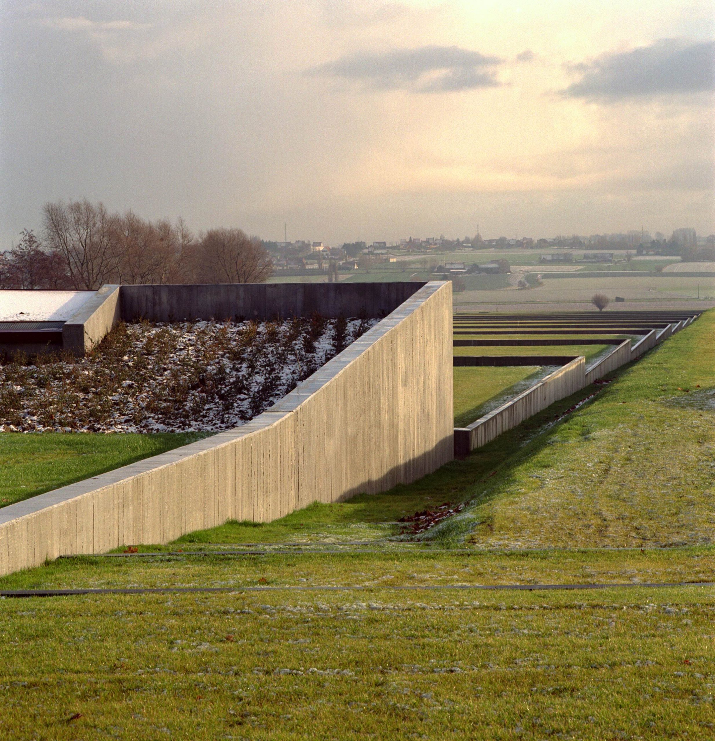 The new cemetery site is on sloping terrain in the southern area of the city. Beyond the crest that marks the natural limits of the city and along which the road runs, the view onto the countryside opens out: the gentle terrain soars and slopes in broad still 'waves' up to reaching the following crest. This undulating Flemish landscape is crossed by a furrow that drives one's gaze towards the bottom of the valley: a route made out of broad flat regular surfaces partially cut into the terrain. The cemetery is totally embedded in the landscape, and is situated at the end of a public thoroughfare that crosses the town of Kortrijk from north to south. A long furrow, separates it off from the land art park. At the entrance a thick wall marks where the cemetery begins. The earth shifting was reduced to a minimum and used to clarify the way the cemetery is laid out: a broad ramp, configured as a sloping square mark the entrance. On one side lies a chamber of ceremonies with related facilities. The structures are covered by surface in corten steel that just peeks up above the terrain, revealing a face of glass panels and a metal grill that opens out onto the valley. A slit separates the chamber of ceremonies from the terrain. It allows the light to filter through and at night becomes a luminous line traced on the ground. Another luminous line along the walls beside the entrance reveals the depth of the square. Award: European Union Prize for Contemporary Architecture - Mies van der Rohe award - nominated -, 2001 Photgraphy: Carine Demeter (Syb’l S Pictures)