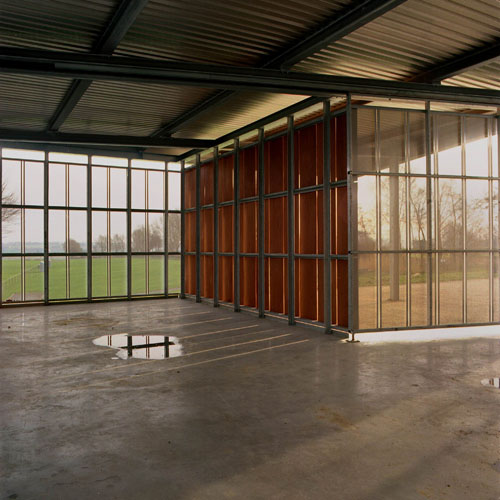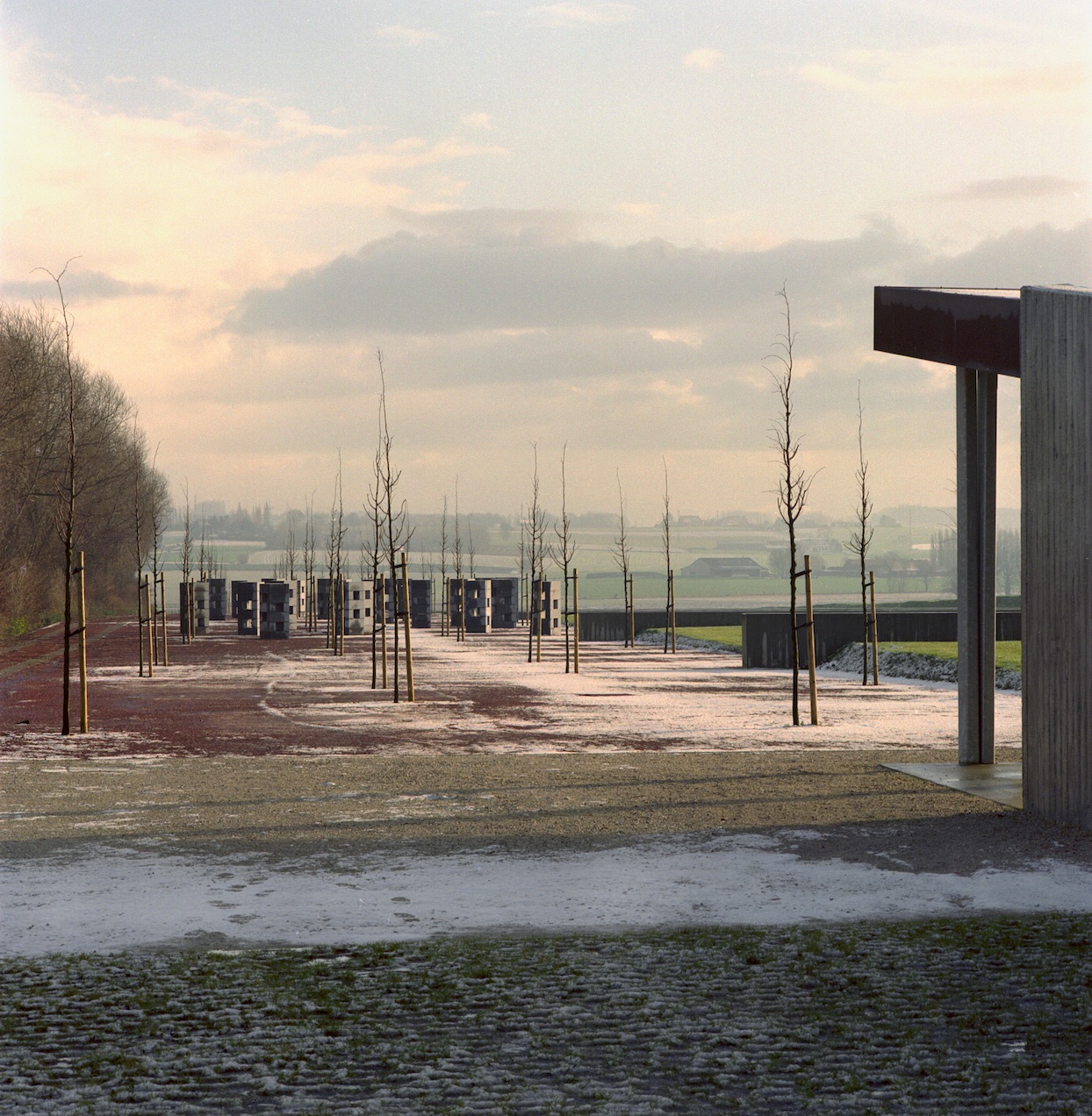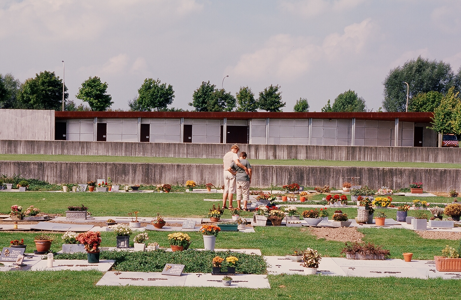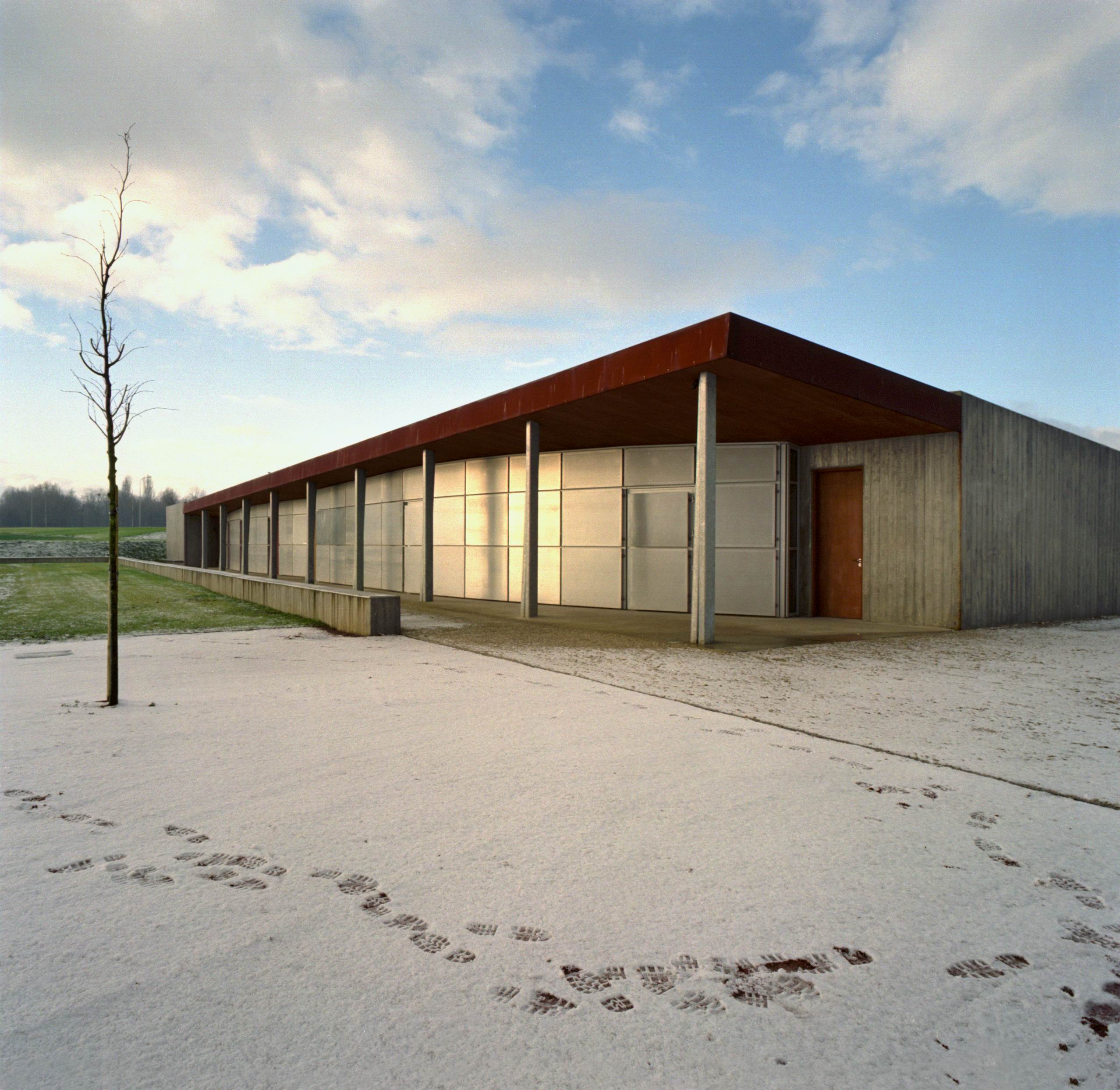 The new cemetery site is on sloping terrain in the southern area of the city. Beyond the crest that marks the natural limits of the city and along which the road runs, the view onto the countryside opens out: the gentle terrain soars and slopes in broad still 'waves' up to reaching the following crest. This undulating Flemish landscape is crossed by a furrow that drives one's gaze towards the bottom of the valley: a route made out of broad flat regular surfaces partially cut into the terrain. The cemetery is totally embedded in the landscape, and is situated at the end of a public thoroughfare that crosses the town of Kortrijk from north to south. A long furrow, separates it off from the land art park. At the entrance a thick wall marks where the cemetery begins. The earth shifting was reduced to a minimum and used to clarify the way the cemetery is laid out: a broad ramp, configured as a sloping square mark the entrance. On one side lies a chamber of ceremonies with related facilities. The structures are covered by surface in corten steel that just peeks up above the terrain, revealing a face of glass panels and a metal grill that opens out onto the valley. A slit separates the chamber of ceremonies from the terrain. It allows the light to filter through and at night becomes a luminous line traced on the ground. Another luminous line along the walls beside the entrance reveals the depth of the square. Award: European Union Prize for Contemporary Architecture - Mies van der Rohe award - nominated -, 2001 Photgraphy: Carine Demeter (Syb’l S Pictures)
