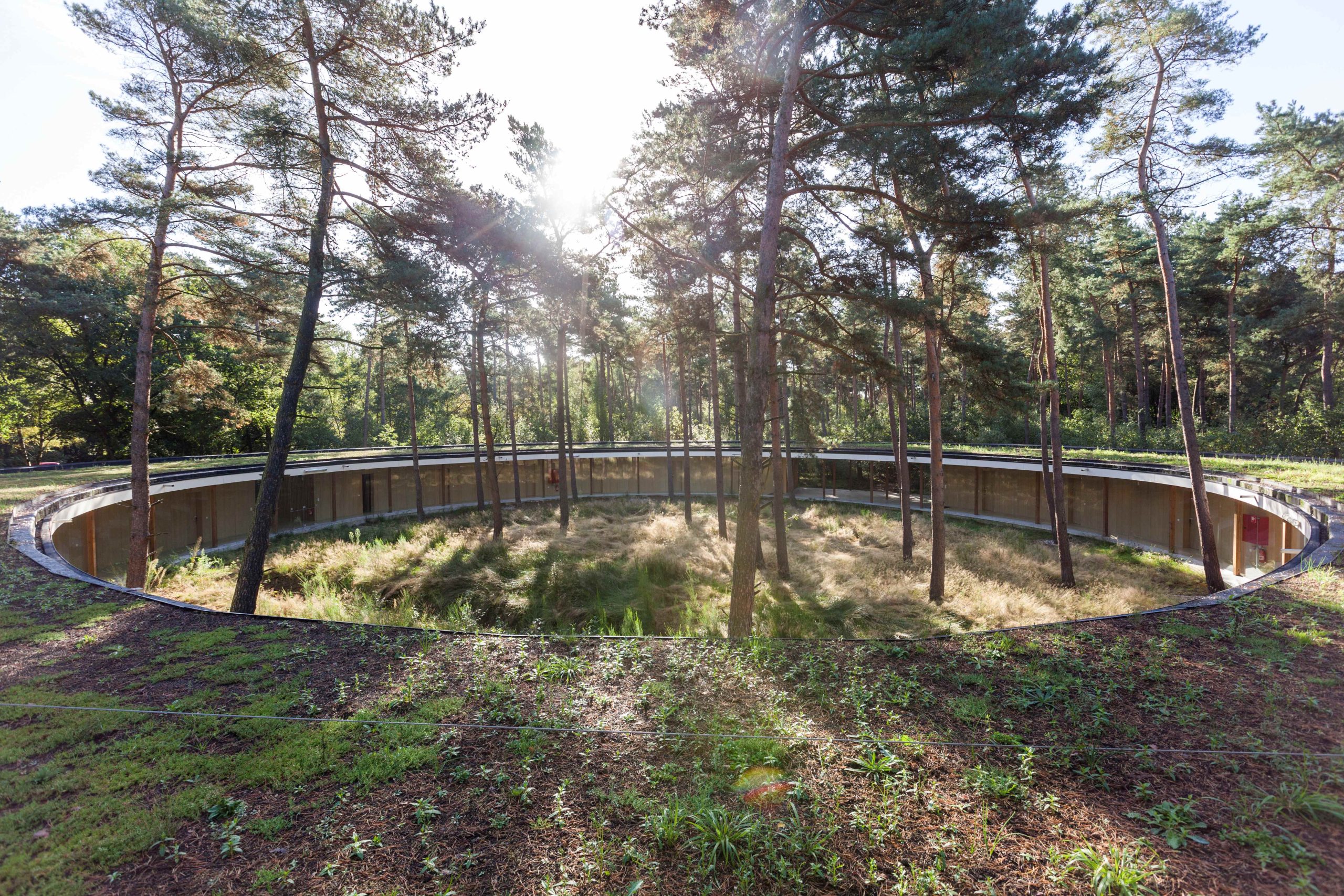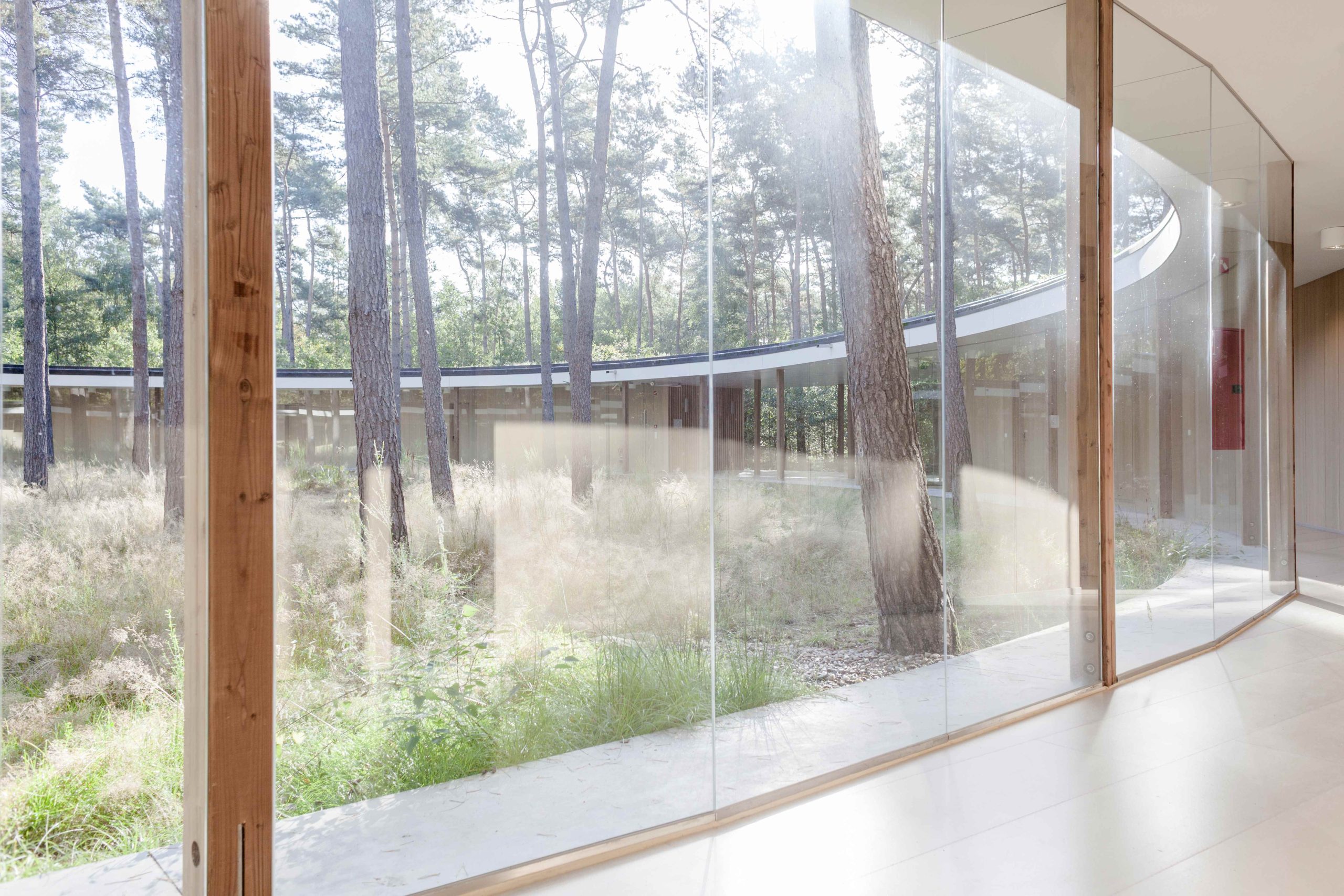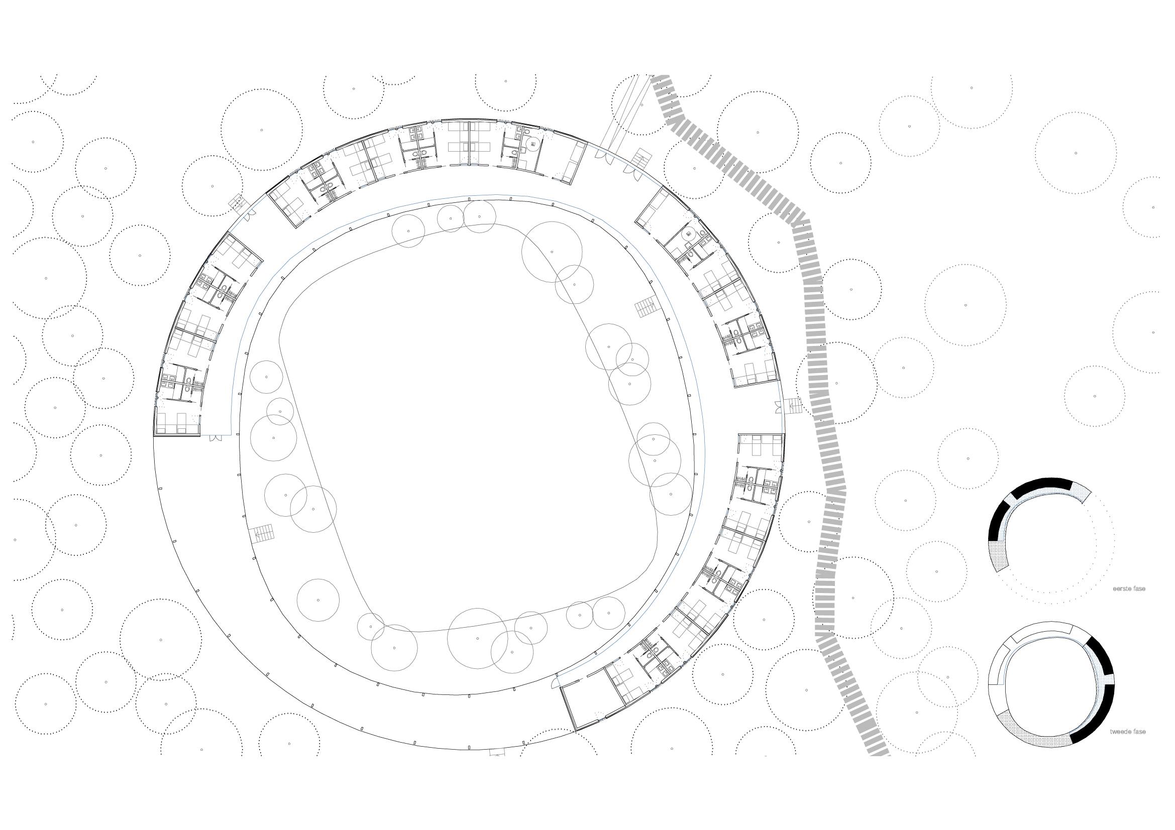 The competition to design the first part of the 'Contact Strip’ is an important step in the implementation of the Hoge Rielen Master Plan. In Hoge Rielen, the Contact Strip is considered a major public space. Along the main road, all public facilities are located. People occupy this area to meet or simply to pass through. The main intention of the master plan was to give some thickness to that line, where could be possible to organize occasional events, green spaces and water points; and to allocate amenities and main public buildings along it. But more than a physical act, the 'Contact Strip is the idea of an extended centrality that works as a guide for future changes that the emerging programs of the leisure center could bring. Today, several years after the completion of the master plan, the programs of the first part of the 'Contact Strip' have slightly changed since the establishment of the master plan. When we introduced the study projects on the site - the hotel at the north edge of the pond, the transformation of the pavilion nr 4 into a multifunctional space in the south and finally, the open space between the reception and the cafeteria, the 'Contact Strip' was considered enriched by these new spaces and facilities that are transversal to the main direction of the existing public sequence. This new spatial condition and the role of the 'Contact Strip' are reinforced by its connection to the cross-links, which are also linked to another crossing, forming a thick, clear mesh. One of these new time project events is Hostel Wadi. By its circular shape it creates a central interior space, a naturalness circumscribed and contained and where the atmosphere is different from the rest of the park. This device allows to establish a special relationship between the users and the hostel itself. Actually, even if the rooms are open to the outside (towards the park), they are serviced by an internal corridor on the outskirts of this central space, that it is separated only by large continuous berries leaving the enjoyment of the views to this last. The interior is a green microcosm that also function as a Wadi collecting rainwater from the building.
